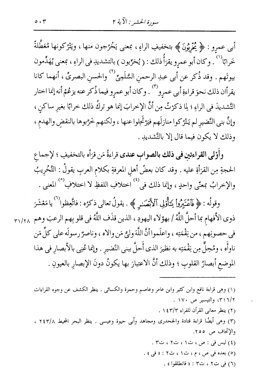 أَبِي عَمْرٍو: {يُخْرِبُونَ} [الحشر: 2] بِتَخْفِيفِ الرَّاءِ، بِمَعْنَى: يَخْرُجُونَ مِنْهَا وَيَتْرُكُونَهَا مُعَطَّلَةً خَرَابًا، وَكَانَ أَبُو عَمْرٍو يَقْرَأُ ذَلِكَ (يُخَرِّبُونَ) بِالتَّشْدِيدِ فِي الرَّاءِ بِمَعْنَى يَهْدِمُونَ بُيُوتَهُمْ. وَقَدْ ذُكِرَ عَنْ أَبِي عَبْدِ الرَّحْمَنِ السُّلَمِيِّ وَالْحَسَنِ الْبَصْرِيِّ أَنَّهُمَا كَانَا يَقْرَأانِ ذَلِكَ نَحْوَ قِرَاءَةِ أَبِي عَمْرٍو. وَكَانَ أَبُو عَمْرٍو فِيمَا ذُكِرَ عَنْهُ يَزْعُمُ أَنَّهُ إِنَّمَا اخْتَارَ التَّشْدِيدَ فِي الرَّاءِ لَمَا ذَكَرْتُ مِنْ أَنَّ الْإِخْرَابَ: إِنَّمَا هُوَ تَرْكُ ذَلِكَ خَرَابًا بِغَيْرِ سَاكِنٍ، وَإِنَّ بَنِي النَّضِيرِ لَمْ يَتْرُكُوا مَنَازِلَهُمْ، فَيَرْتَحِلُوا عَنْهَا، وَلَكِنَّهُمْ خَرَّبُوهَا بِالنَّقْضِ وَالْهَدْمِ، وَذَلِكَ لَا يَكُونُ فِيمَا قَالَ إِلَّا بِالتَّشْدِيدِ. وَأَوْلَى الْقِرَاءَتَيْنِ فِي ذَلِكَ بِالصَّوَابِ عِنْدِي قِرَاءَةُ مَنْ قَرَأَهُ بِالتَّخْفِيفِ لِإِجْمَاعِ الْحُجَّةِ مِنَ الْقُرَّاءِ عَلَيْهِ. وَقَدْ كَانَ بَعْضُ أَهْلِ الْمَعْرِفَةِ بِكَلَامِ الْعَرَبِ يَقُولُ: التَّخْرِيبُ وَالْإِخْرَابُ بِمَعْنًى وَاحِدٍ، وَإِنَّمَا ذَلِكَ فِي اخْتِلَافِ اللَّفْظِ لَا اخْتِلَافٍ فِي الْمَعْنَى.