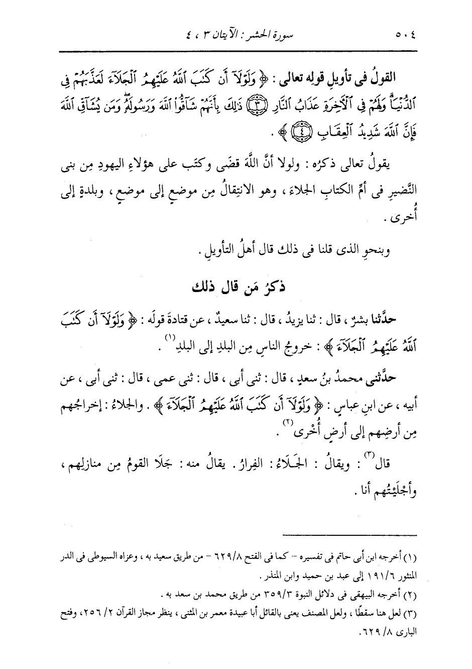 §الْقَوْلُ فِي تَأْوِيلِ قَوْلِهِ تَعَالَى: {وَلَوْلَا أَنْ كَتَبَ اللَّهُ عَلَيْهِمُ الْجَلَاءَ لَعَذَّبَهُمْ فِي الدُّنْيَا وَلَهُمْ فِي الْآخِرَةِ عَذَابُ النَّارِ ذَلِكَ بِأَنَّهُمْ شَاقُّوا اللهَ وَرَسُولَهُ وَمَن يُشَاقِّ اللهَ فَإِنَّ اللهَ شَدِيدُ الْعِقَابِ} [الحشر: 4] يَقُولُ تَعَالَى ذِكْرُهُ: وَلَوْلَا أَنَّ اللَّهَ قَضَى وَكَتَبَ عَلَى هَؤُلَاءِ الْيَهُودِ مِنْ بَنِي النَّضِيرِ فِي أُمِّ الْكِتَابِ الْجَلَاءَ، وَهُوَ الِانْتِقَالُ مِنْ مَوْضِعٍ إِلَى مَوْضِعٍ، وَبَلْدَةٍ إِلَى أُخْرَى. وَبِنَحْوِ الَّذِي قُلْنَا فِي ذَلِكَ قَالَ أَهْلُ التَّأْوِيلِ.