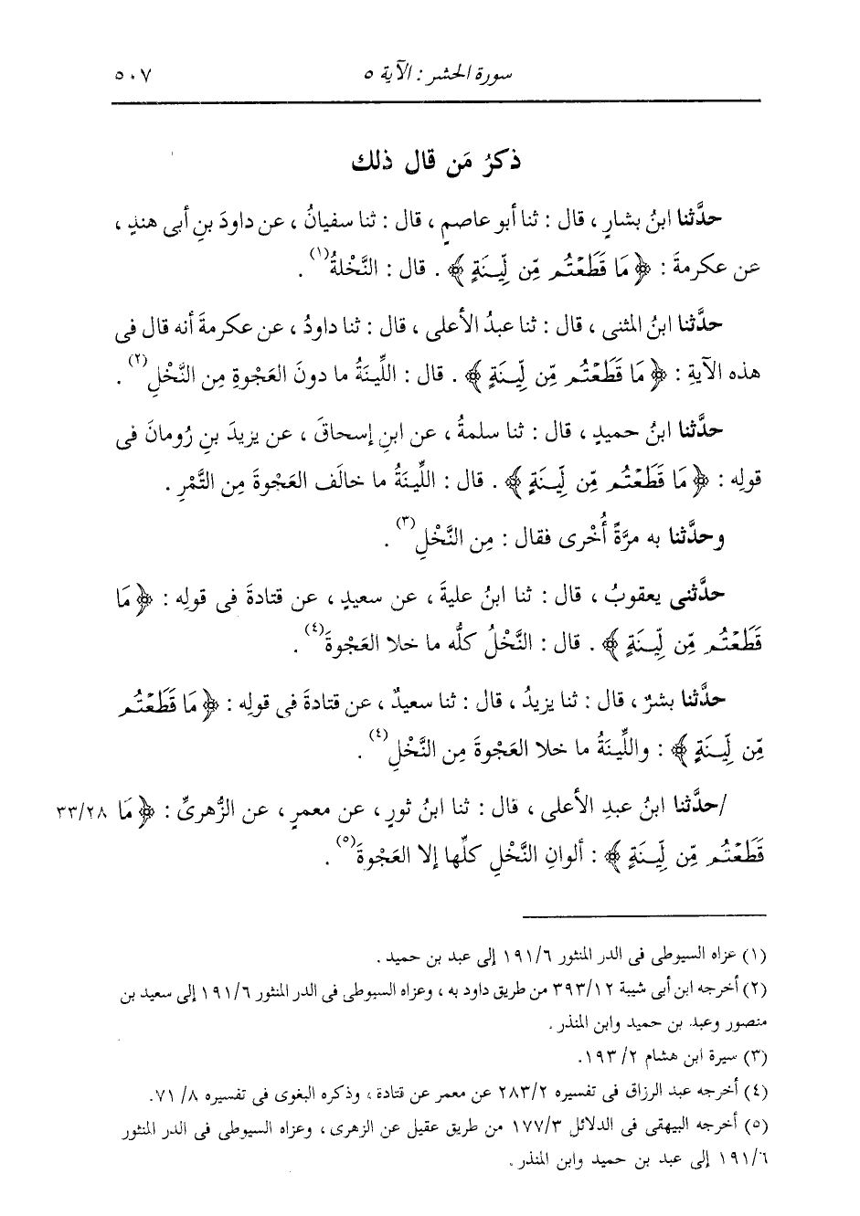 ذِكْرُ مَنْ قَالَ ذَلِكَ حَدَّثَنَا ابْنُ بَشَّارٍ، قَالَ: ثنا أَبُو عَاصِمٍ، قَالَ: ثنا سُفْيَانُ، عَنْ دَاوُدَ بْنِ أَبِي هِنْدٍ، عَنْ عِكْرِمَةَ: {§مَا قَطَعْتُمْ مِنْ لِينَةٍ} [الحشر: 5] قَالَ: النَّخْلَةُ حَدَّثَنَا ابْنُ الْمُثَنَّى، قَالَ: ثنا عَبْدُ الْأَعْلَى، قَالَ: ثنا دَاوُدُ، عَنْ عِكْرِمَةَ، أَنَّهُ قَالَ فِي هَذِهِ الْآيَةِ: {مَا قَطَعْتُمْ مِنْ لِينَةٍ أَوْ تَرَكْتُمُوهَا} [الحشر: 5] قَالَ: اللِّينَةُ: مَا دُونَ الْعَجْوَةِ مِنَ النَّخْلِ حَدَّثَنَا ابْنُ حُمَيْدٍ، قَالَ: ثنا سَلَمَةُ، عَنِ ابْنِ إِسْحَاقَ، عَنْ يَزِيدَ بْنِ رُومَانَ، فِي قَوْلِهِ: {مَا قَطَعْتُمْ مِنْ لِينَةٍ} [الحشر: 5] قَالَ: اللِّينَةُ: مَا خَالَفَ الْعَجْوَةَ مِنَ التَّمْرِ. وَحَدَّثَنَا بِهِ مَرَّةً أُخْرَى فَقَالَ: مِنَ النَّخْلِ