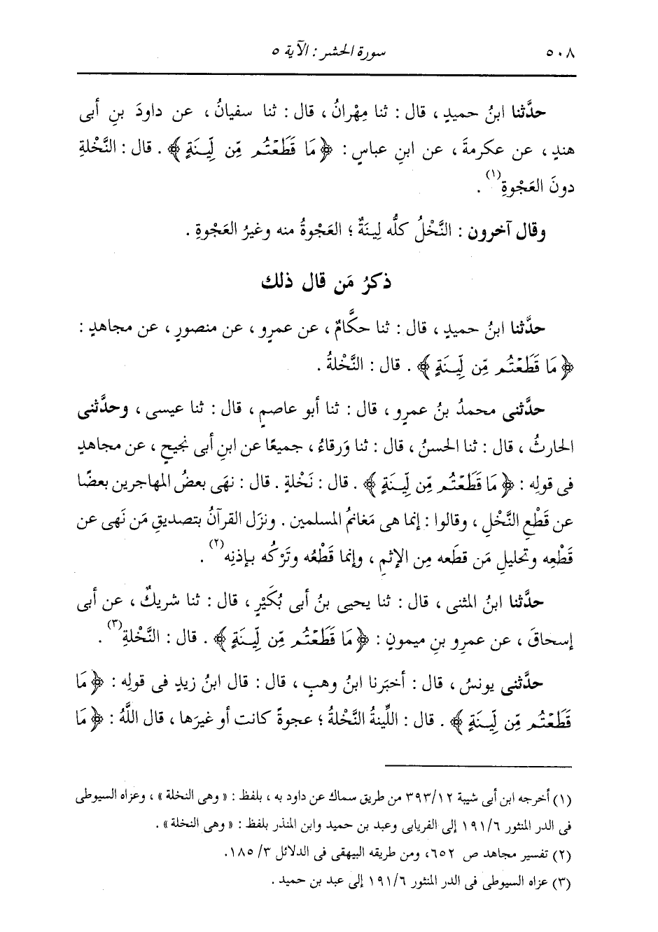 ذِكْرُ مَنْ قَالَ ذَلِكَ حَدَّثَنَا ابْنُ حُمَيْدٍ، قَالَ: ثنا حَكَّامٌ، عَنْ عَمْرٍو، عَنْ مَنْصُورٍ، عَنْ مُجَاهِدٍ، {مَا قَطَعْتُمْ مِنْ §لِينَةٍ} [الحشر: 5] قَالَ: النَّخْلَةُ