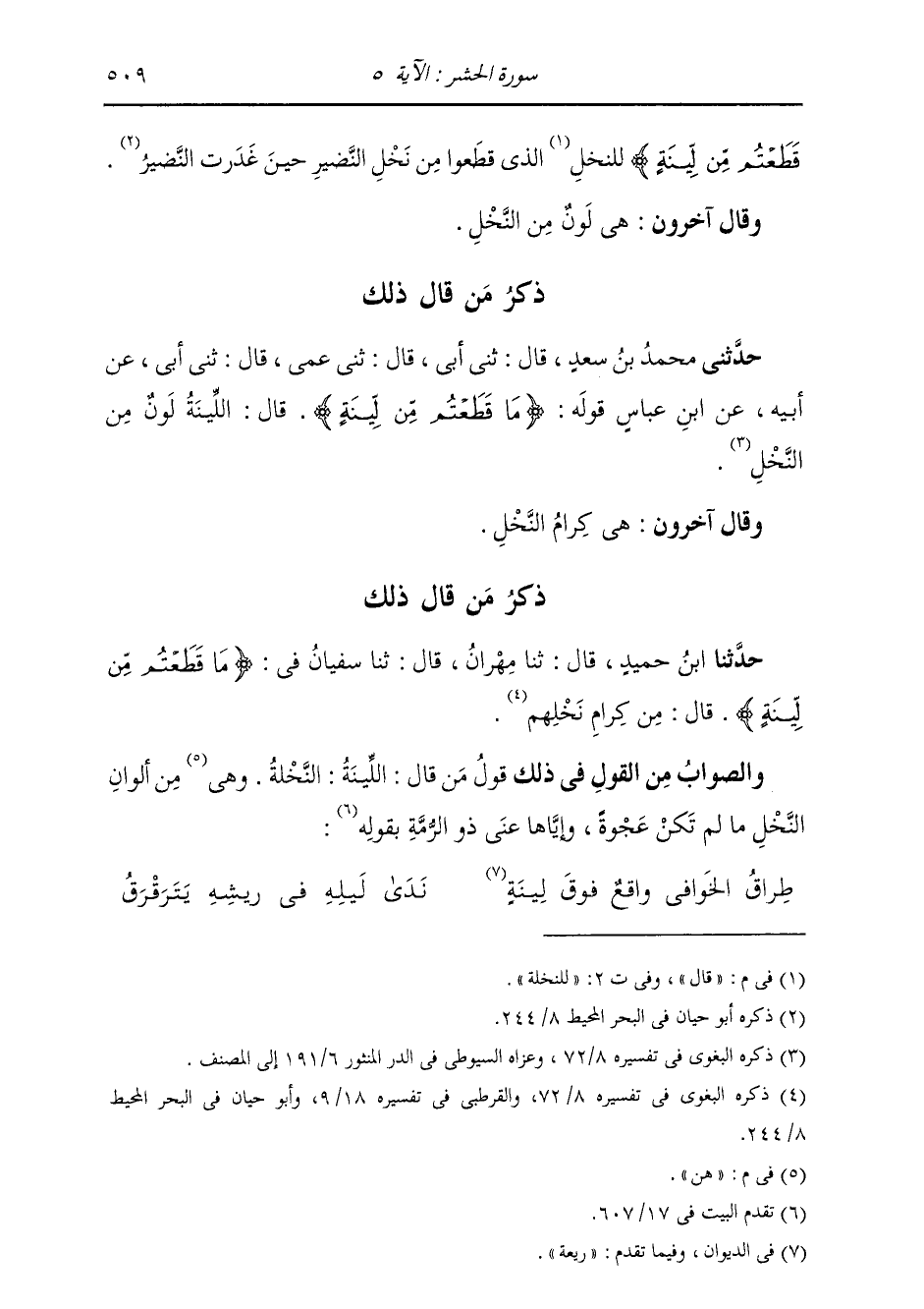 ذِكْرُ مَنْ قَالَ ذَلِكَ حَدَّثَنَا ابْنُ حُمَيْدٍ، قَالَ: ثنا مِهْرَانُ، قَالَ: ثنا سُفْيَانُ، فِي {§مَا قَطَعْتُمْ مِنْ لِينَةٍ} [الحشر: 5] قَالَ: مِنْ كِرَامِ نَخْلِهِمْ وَالصَّوَابُ مِنَ الْقَوْلِ فِي ذَلِكَ قَوْلُ مَنْ قَالَ: اللِّينَةُ: النَّخْلَةُ، وَهُنَّ مِنْ أَلْوَانِ النَّخْلِ مَا لَمْ تَكُنْ عَجْوَةً، وَإِيَّاهَا عَنَى ذُو الرِّمَّةِ بِقَوْلِهِ: