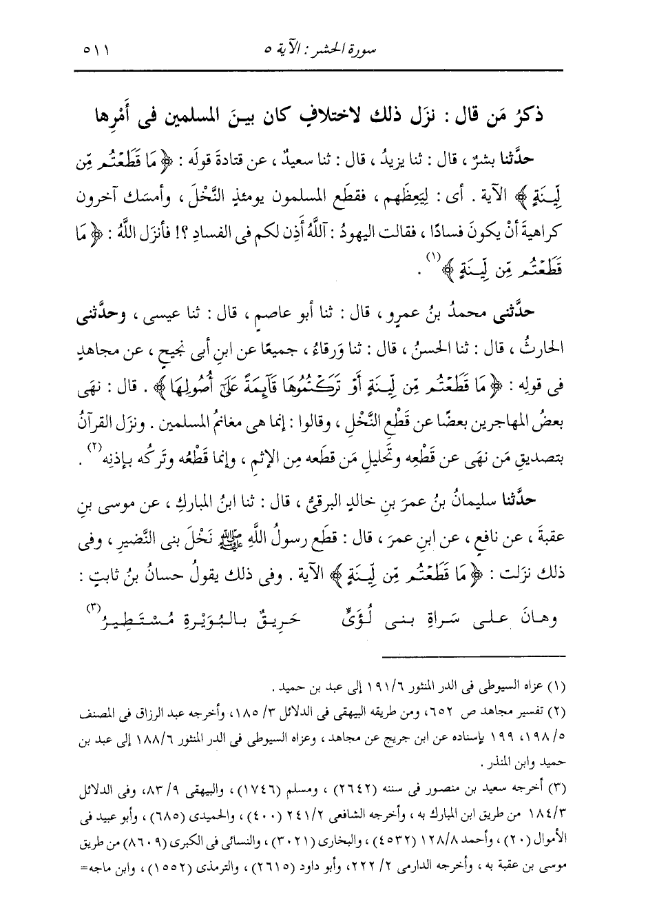 حَدَّثَنِي مُحَمَّدُ بْنُ عَمْرٍو، قَالَ: ثنا أَبُو عَاصِمٍ، قَالَ: ثنا عِيسَى، وَحَدَّثَنِي الْحَارِثُ، قَالَ: ثنا الْحَسَنُ، قَالَ: ثنا وَرْقَاءُ، جَمِيعًا عَنِ ابْنِ أَبِي نَجِيحٍ، عَنْ مُجَاهِدٍ، فِي قَوْلِهِ: {مَا قَطَعْتُمْ مِنْ لِينَةٍ أَوْ تَرَكْتُمُوهَا قَائِمَةً عَلَى أُصُولِهَا} [الحشر: 5] قَالَ: §نَهَى بَعْضُ الْمُهَاجِرِينَ بَعْضًا عَنْ قَطْعِ النَّخْلِ، وَقَالُوا: إِنَّمَا هِيَ مَغَانِمُ الْمُسْلِمِينَ، وَنَزَلَ الْقُرْآنُ بِتَصْدِيقِ مَنْ نَهَى عَنْ قَطْعِهِ، وَتَحْلِيلِ مَنْ قَطَعَهُ مِنَ الْإِثْمِ، وَإِنَّمَا قَطْعُهُ وَتَرْكُهُ بِإِذْنِهِ