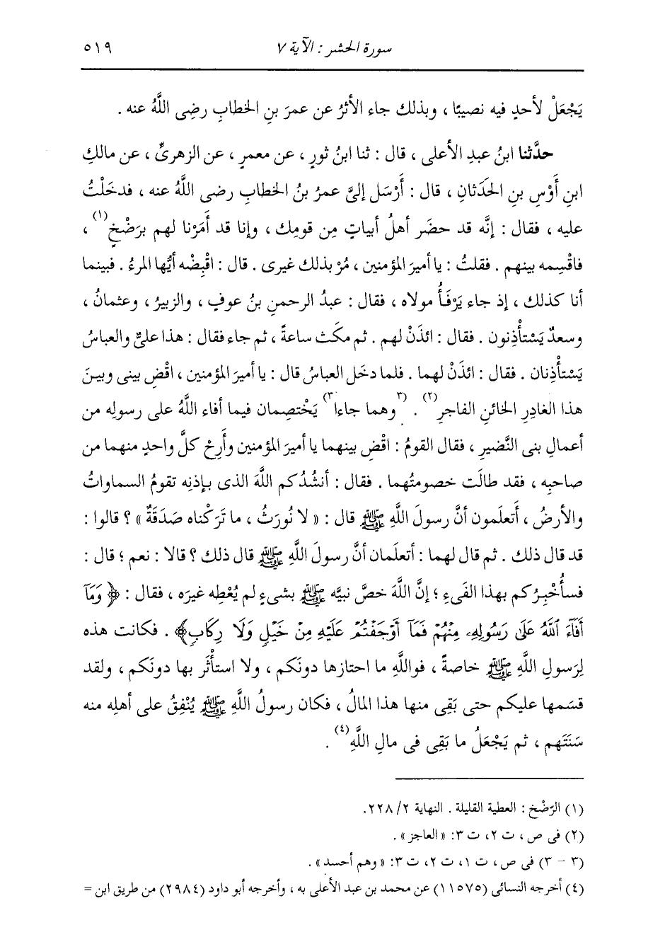 حَدَّثَنَا ابْنُ عَبْدِ الْأَعْلَى، قَالَ: ثنا ابْنُ ثَوْرٍ، عَنْ مَعْمَرٍ، عَنِ الزُّهْرِيِّ، عَنْ مَالِكِ بْنِ أَوْسِ بْنِ الْحَدَثَانِ، قَالَ: أَرْسَلَ إِلَيَّ عُمَرُ بْنُ الْخَطَّابِ رَضِيَ اللَّهُ عَنْهُ، فَدَخَلْتُ عَلَيْهِ، فَقَالَ: إِنَّهُ قَدْ حَضَرَ أَهْلُ أَبْيَاتٍ مِنْ قَوْمِكَ وَإِنَّا قَدْ أَمَرْنَا لَهُمْ بِرَضْخٍ، فَاقْسِمْهُ بَيْنَهُمْ، فَقُلْتُ: يَا أَمِيرَ الْمُؤْمِنِينَ مُرْ بِذَلِكَ غَيْرِي، قَالَ: اقْبِضْهُ أَيُّهَا الْمَرْءُ؛ فَبَيْنَا أَنَا كَذَلِكَ، إِذْ جَاءَ يَرْفَأُ مَوْلَاهُ، فَقَالَ: عَبْدُ الرَّحْمَنِ بْنُ عَوْفٍ، وَالزُّبَيْرُ، وَعُثْمَانُ، وَسَعْدٌ يَسْتَأْذِنُونَ، فَقَالَ: ائْذَنْ لَهُمْ؛ ثُمَّ مَكَثَ سَاعَةً، ثُمَّ جَاءَ فَقَالَ: هَذَا عَلِيٌّ وَالْعَبَّاسُ يَسْتأْذِنَانِ، فَقَالَ: ائْذَنْ لَهُمَا؛ فَلَمَّا دَخَلَ الْعَبَّاسُ قَالَ: يَا أَمِيرَ الْمُؤْمِنِينَ اقْضِ بَيْنِي وَبَيْنَ هَذَا الْغَادِرِ الْخَائِنِ الْفَاجِرِ، وَهُمَا جَاءَا يَخْتَصِمَانِ فِيمَا أَفَاءَ اللَّهُ عَلَى رَسُولِهِ مِنْ أَعْمَالِ بَنِي النَّضِيرِ، فَقَالَ الْقَوْمُ: اقْضِ بَيْنَهُمَا يَا أَمِيرَ الْمُؤْمِنِينَ، وَأَرِحْ كُلَّ وَاحِدٍ مِنْهُمَا مِنْ صَاحِبِهِ، فَقَدْ طَالَتْ خُصُومَتُهُمَا، فَقَالَ: أَنْشُدُكُمُ اللَّهَ الَّذِي بِإِذْنِهِ تَقُومُ السَّمَوَاتُ وَالْأَرْضُ، أَتَعْلَمُونَ أَنَّ رَسُولَ اللَّهِ صَلَّى اللهُ عَلَيْهِ وَسَلَّمَ قَالَ: «§لَا نُورَثُ مَا تَرَكْنَاهُ صَدَقَةٌ» قَالُوا: قَدْ قَالَ ذَلِكَ؛ ثُمَّ قَالَ لَهُمَا: أَتَعْلَمَانِ أَنَّ رَسُولَ اللَّهِ صَلَّى اللهُ عَلَيْهِ وَسَلَّمَ قَالَ ذَلِكَ؟ قَالَا: نَعَمْ؛ قَالَ: فَسَأُخْبِرُكُمْ بِهَذَا الْفَيْءِ؛ إِنَّ اللَّهَ خَصَّ نَبِيَّهُ صَلَّى اللهُ عَلَيْهِ وَسَلَّمَ بِشَيْءٍ لَمْ يُعْطِهِ غَيْرَهُ، فَقَالَ: {وَمَا أَفَاءَ اللَّهُ عَلَى رَسُولِهِ مِنْهُمْ فَمَا أَوْجَفْتُمْ عَلَيْهِ مِنْ خَيْلٍ وَلَا رِكَابٍ} [الحشر: 6] فَكَانَتْ هَذِهِ لِرَسُولِ اللَّهِ صَلَّى اللهُ عَلَيْهِ وَسَلَّمَ خَاصَّةً، فَوَاللَّهِ مَا احْتَازَهَا دُونَكُمْ، وَلَا اسْتَأْثَرَ بِهَا دُونَكُمْ، وَلَقَدْ قَسَمَهَا عَلَيْكُمْ حَتَّى بَقِيَ مِنْهَا هَذَا الْمَالُ، فَكَانَ رَسُولُ اللَّهِ صَلَّى اللهُ عَلَيْهِ وَسَلَّمَ يُنْفِقُ عَلَى أَهْلِهِ مِنْهُ سَنَتَهُمْ، ثُمَّ يَجْعَلُ مَا بَقِيَ فِي مَالِ اللَّهِ -[520]- فَإِذَا كَانَتْ هَذِهِ الْآيَةُ الَّتِي قَبْلَهَا مَضَتْ، وَذُكِرَ الْمَالُ الَّذِي خَصَّ اللَّهُ بِهِ رَسُولَهُ صَلَّى اللهُ عَلَيْهِ وَسَلَّمَ، وَلَمْ يَجْعَلْ لِأَحَدٍ مَعَهُ شَيْئًا، وَكَانَتْ هَذِهِ الْآيَةُ خَبَرًا عَنِ الْمَالِ الَّذِي جَعَلَهُ اللَّهُ لِأَصْنَافٍ شَتَّى، كَانَ مَعْلُومًا بِذَلِكَ أَنَّ الْمَالَ الَّذِي جَعَلَهُ لِأَصْنَافٍ مِنْ خَلْقِهِ غَيْرُ الْمَالِ الَّذِي جَعَلَهُ لِلنَّبِيِّ صَلَّى اللهُ عَلَيْهِ وَسَلَّمَ خَاصَّةً، وَلَمْ يَجْعَلْ لَهُ شَرِيكًا
