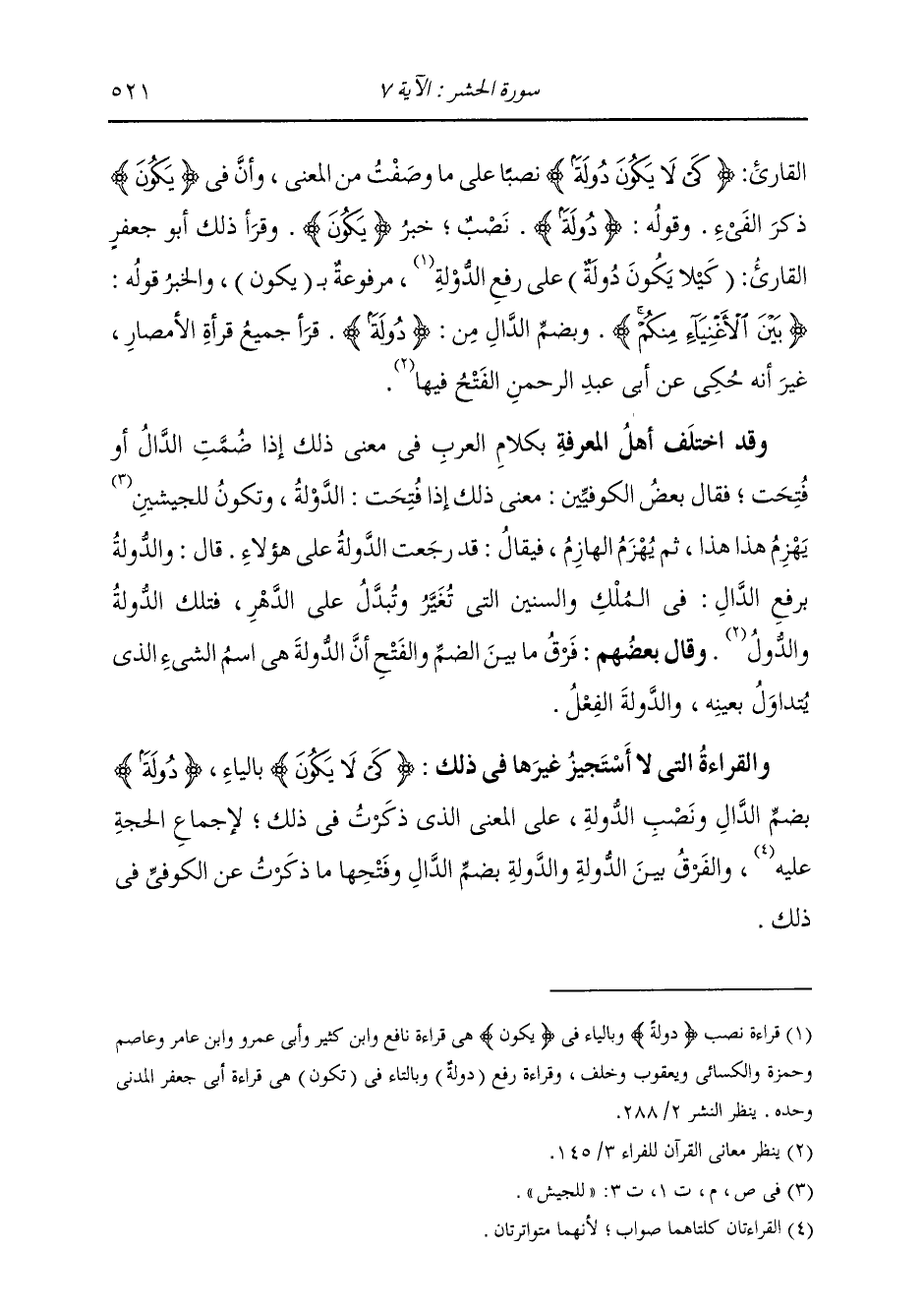 الْقَارِئِ {كَيْ لَا يَكُونَ دُولَةً} [الحشر: 7] نَصَبًا عَلَى مَا وَصَفْتُ مِنَ الْمَعْنَى، أَنَّ فِي يَكُونَ ذِكْرَ الْفَيْءِ. وَقَوْلُهُ: {دُولَةً} [الحشر: 7] نُصِبَ خَبَرَ يَكُونَ، وَقَرَأَ ذَلِكَ أَبُو جَعْفَرٍ الْقَارِئُ: (كَيْ لَا يَكُونَ دَوْلَةٌ) عَلَى رَفْعِ الدُّولَةِ مَرْفُوعَةً بِيَكُونَ، وَالْخَبَرُ قَوْلُهُ: {بَيْنَ الْأَغْنِيَاءِ مِنْكُمْ} [الحشر: 7] وَبِضَمِّ الدَّالِ مِنْ {دُولَةً} [الحشر: 7] قَرَأَ جَمِيعُ قُرَّاءِ الْأَمْصَارِ، غَيْرَ أَنَّهُ حُكِيَ عَنْ أَبِي عَبْدِ الرَّحْمَنِ الْفَتْحُ فِيهَا. وَقَدِ اخْتَلَفَ أَهْلُ الْمَعْرِفَةِ بِكَلَامِ الْعَرَبِ فِي مَعْنَى ذَلِكَ، إِذَا ضُمَّتِ الدَّالُ أَوْ فُتِحَتْ، فَقَالَ بَعْضُ الْكُوفِيِّينَ: مَعْنَى ذَلِكَ: إِذَا فُتِحَتِ الدَّوْلَةُ وَتَكُونُ لِلْجَيْشِ يَهْزِمُ هَذَا هَذَا، ثُمَّ يُهْزَمُ الْهَازِمُ، فَيُقَالُ: قَدْ رَجَعَتِ الدَّوْلَةُ عَلَى هَؤُلَاءِ؛ قَالَ: وَالدُّولَةُ بِرَفْعِ الدَّالِ فِي الْمُلْكِ وَالسِّنِينَ الَّتِي تُغَيَّرُ وَتُبَدَّلُ عَلَى الدَّهْرِ، فَتِلْكَ الدُّولَةُ وَالدُّوَلُ. وَقَالَ بَعْضُهُمْ: فَرْقُ مَا بَيْنَ الضَّمِّ وَالْفَتْحِ أَنَّ الدُّولَةَ: هِيَ اسْمُ الشَّيْءِ الَّذِي يُتَدَاوَلُ بِعَيْنِهِ، وَالدَّوْلَةُ الْفِعْلُ. وَالْقِرَاءَةُ الَّتِي لَا أَسْتَجِيزُ غَيْرَهَا فِي ذَلِكَ: {كَيْ لَا يَكُونَ} [الحشر: 7] بِالْيَاءِ {دُولَةً} [الحشر: 7] بِضَمِّ الدَّالِ وَنَصْبِ الدَّوْلَةِ عَلَى الْمَعْنَى الَّذِي ذَكَرْتُ فِي ذَلِكَ لِإِجْمَاعِ الْحُجَّةِ عَلَيْهِ، وَالْفَرْقُ بَيْنَ الدُّولَةِ وَالدَّوْلَةِ بِضَمِّ الدَّالِ وَفَتْحِهَا مَا ذَكَرْتُ عَنِ الْكُوفِيِّ فِي ذَلِكَ.
