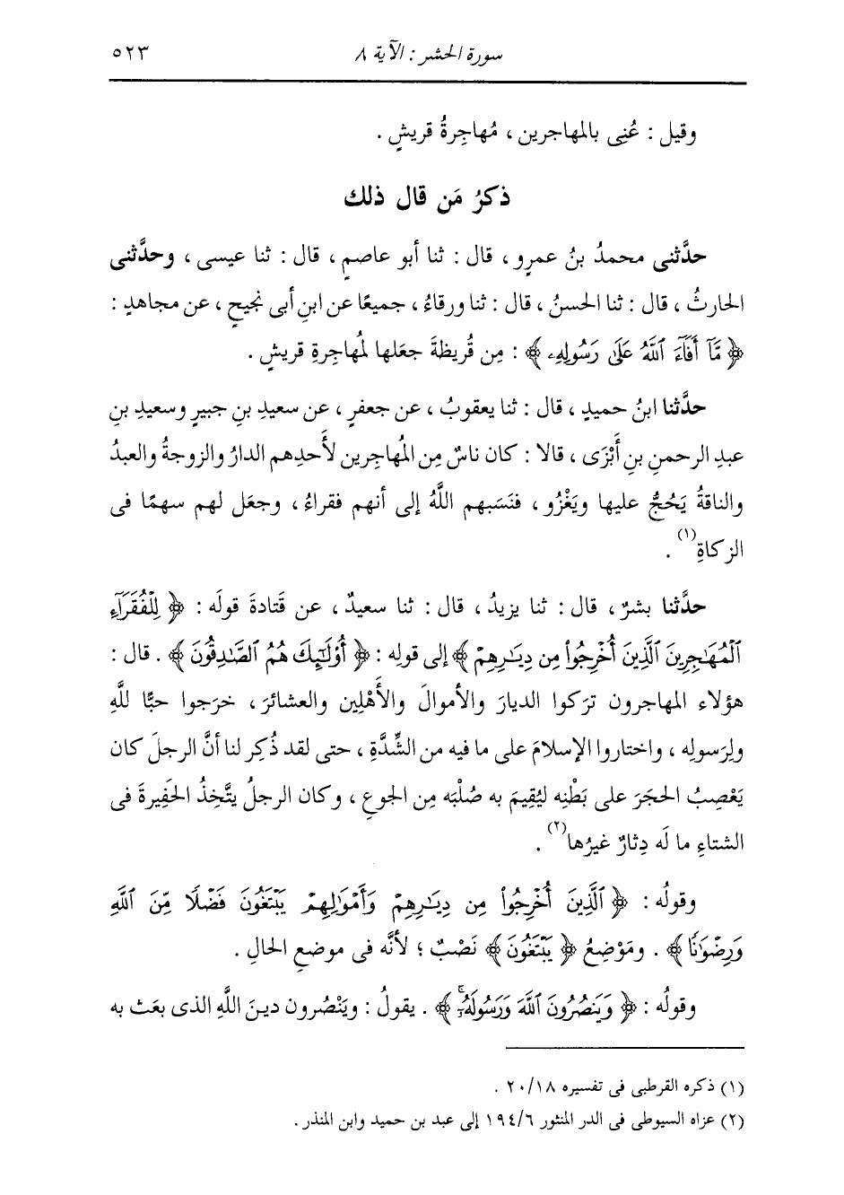 حَدَّثَنَا بِشْرٌ، قَالَ: ثنا يَزِيدُ، قَالَ: ثنا سَعِيدٌ، عَنْ قَتَادَةَ، قَوْلُهُ: {لِلْفُقَرَاءِ الْمُهَاجِرِينَ الَّذِينَ أَخْرِجُوا مِنْ دِيَارِهِمْ} [الحشر: 8] إِلَى قَوْلِهِ: {أُولَئِكَ هُمُ الصَّادِقُونَ} [الحجرات: 15] قَالَ: هَؤُلَاءِ §الْمُهَاجِرُونَ تَرَكُوا الدِّيَارَ وَالْأَمْوَالَ وَالْأَهْلِينَ وَالْعَشَائِرَ، خَرَجُوا حُبًّا لِلَّهِ وَلِرَسُولِهِ، وَاخْتَارُوا الْإِسْلَامَ عَلَى مَا فِيهِ مِنَ الشِّدَّةِ، حَتَّى لَقَدْ ذُكِرَ لَنَا أَنَّ الرَّجُلَ كَانَ يَعْصِبُ الْحَجَرَ عَلَى بَطْنِهِ لِيُقِيمَ بِهِ صُلْبَهُ مِنَ الْجُوعِ، وَكَانَ الرَّجُلُ يَتَّخِذُ الْحَفِيرَةَ فِي الشِّتَاءِ مَا لَهُ دِثَارٌ غَيْرَهَا وَقَوْلُهُ: {الَّذِينَ أَخْرِجُوا مِنْ دِيَارِهِمْ وَأَمْوَالِهِمْ} [الحشر: 8] وَقَوْلُهُ: {يَبْتَغُونَ فَضْلًا مِنَ اللَّهِ وَرِضْوَانًا} [الفتح: 29] مَوْضِعُ يَبْتَغُونَ نَصْبٌ، لِأَنَّهُ فِي مَوْضِعِ الْحَالِ