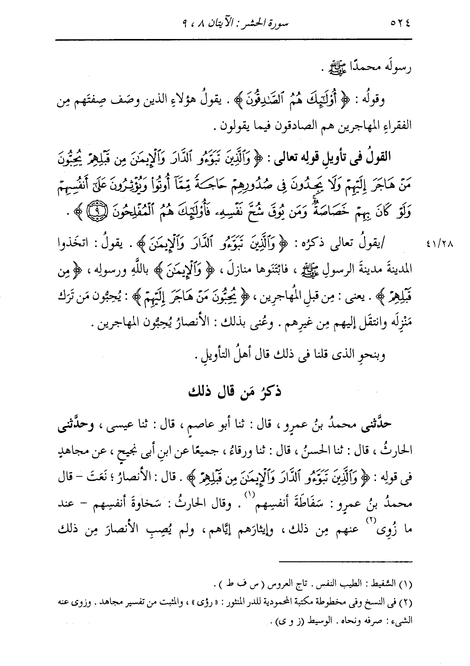 ذِكْرُ مَنْ قَالَ ذَلِكَ حَدَّثَنِي مُحَمَّدُ بْنُ عَمْرٍو، قَالَ: ثنا أَبُو عَاصِمٍ، قَالَ: ثنا عِيسَى، وَحدَّثَنِي الْحَارِثُ، قَالَ: ثنا الْحَسَنُ، قَالَ: ثنا وَرْقَاءُ، جَمِيعًا عَنِ ابْنِ أَبِي نَجِيحٍ، عَنْ مُجَاهِدٍ، فِي قَوْلِهِ: {§وَالَّذِينَ تَبَوَّءُوا الدَّارَ وَالْإِيمَانَ مِنْ قَبْلِهِمْ} قَالَ: الْأَنْصَارُ نَعْتٌ. قَالَ مُحَمَّدُ بْنُ عَمْرٍو: سُفَاطَةِ أَنْفُسِهِمْ. وَقَالَ الْحَارِثُ: سَخَاوَةُ أَنْفُسِهِمْ عِنْدَمَا رَوَى عَنْهُمْ مِنْ ذَلِكَ، وَإِيثَارُهُمْ إِيَّاهُمْ وَلَمْ يُصِبِ الْأَنْصَارَ مِنْ ذَلِكَ -[525]- الْفَيْءِ شَيْءٌ