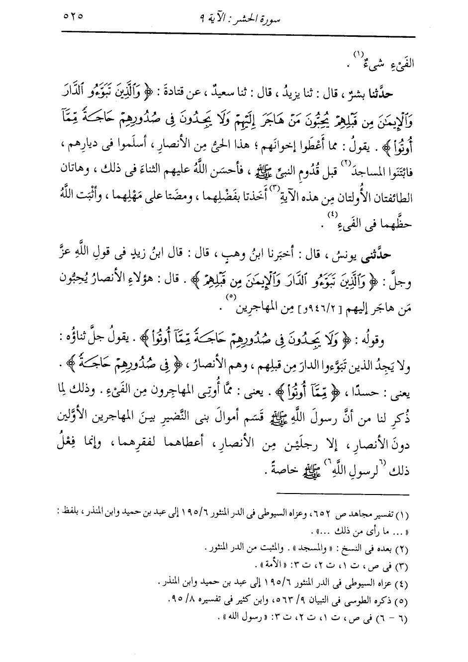 حَدَّثَنَا بِشْرٌ، قَالَ: ثنا يَزِيدُ، قَالَ: ثنا سَعِيدٌ، عَنْ قَتَادَةَ، {وَالَّذِينَ تَبَوَّءُوا الدَّارَ وَالْإِيمَانَ مِنْ قَبْلِهِمْ يُحِبُّونَ مَنْ هَاجَرَ إِلَيْهِمْ وَلَا يَجِدُونَ فِي صُدُورِهِمْ حَاجَةً مِمَّا أُوتُوا} يَقُولُ: مِمَّا §أَعْطَوْا إِخْوَانَهُمْ هَذَا الْحَيَّ مِنَ الْأَنْصَارِ، أَسْلَمُوا فِي دِيَارِهِمْ، فَابْتَنُوا الْمَسَاجِدَ وَالْمَسْجِدَ، قَبْلَ قَدُومِ النَّبِيِّ صَلَّى اللهُ عَلَيْهِ وَسَلَّمَ فَأَحْسَنَ اللَّهُ عَلَيْهِمُ الثَّنَاءَ فِي ذَلِكَ وَهَاتَانِ الطَّائِفَتَانِ الْأُولَيَانِ مِنْ هَذِهِ الْآيَةِ أَخَذَتَا بِفَضْلِهِمَا، وَمَضَتَا عَلَى مَهْلِهِمَا، وَأَثْبَتَ اللَّهُ حَظَّهُمَا فِي الْفَيْءِ