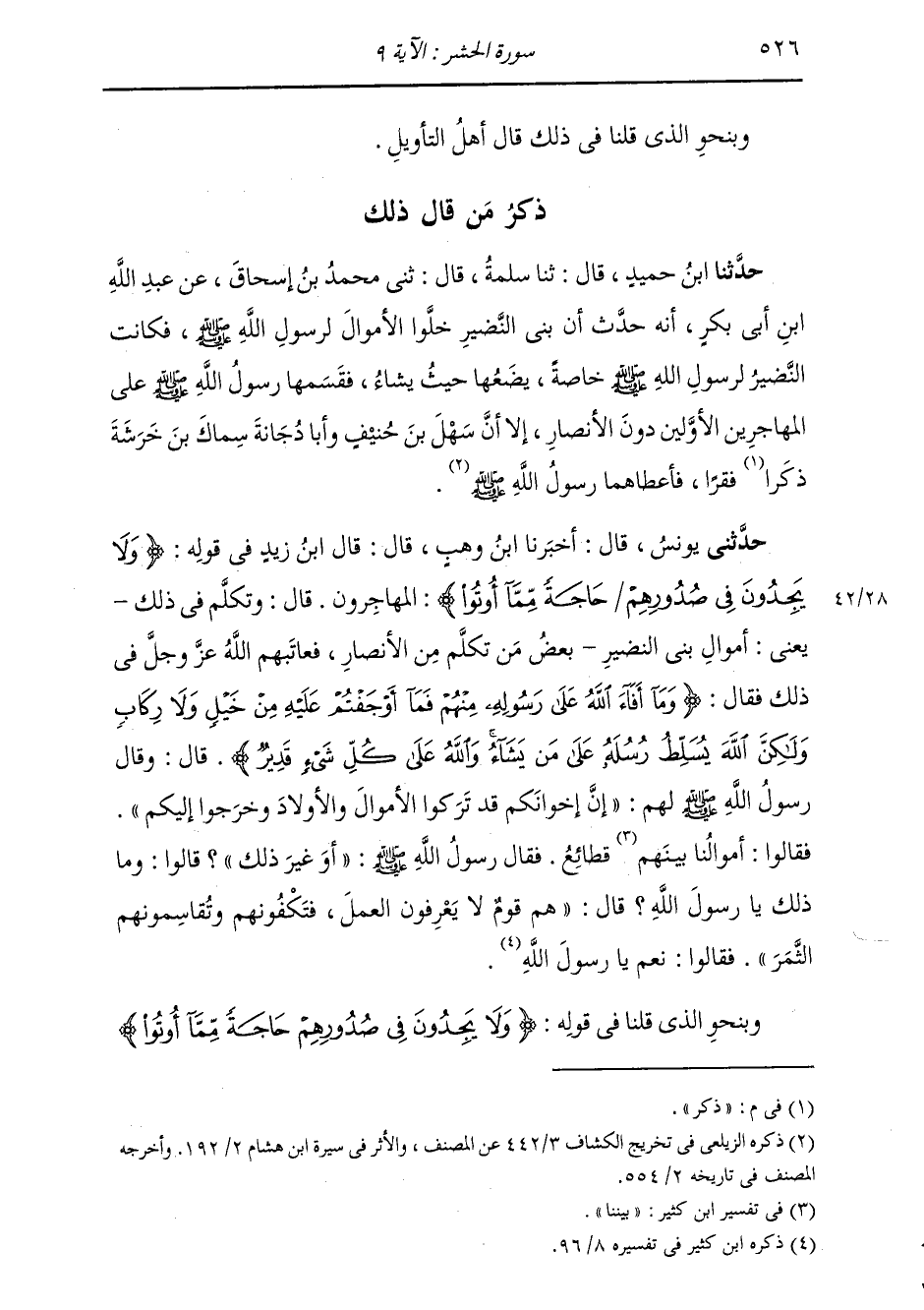 حَدَّثَنِي يُونُسُ، قَالَ: أَخْبَرَنَا ابْنُ وَهْبٍ، قَالَ: قَالَ ابْنُ زَيْدٍ، فِي قَوْلِهِ: {وَلَا يَجِدُونَ فِي صُدُورِهِمْ حَاجَةً مِمَّا أُوتُوا} [الحشر: 9] الْمُهَاجِرُونَ، قَالَ: وَتَكَلَّمَ فِي ذَلِكَ، يَعْنِي أَمْوَالَ بَنِي النَّضِيرِ، بَعْضُ مَنْ تَكَلَّمَ مِنَ الْأَنْصَارِ، فَعَاتَبَهُمُ اللَّهُ عَزَّ وَجَلَّ فِي ذَلِكَ فَقَالَ: {وَمَا أَفَاءَ اللَّهُ عَلَى رَسُولِهِ مِنْهُمْ فَمَا أَوْجَفْتُمْ عَلَيْهِ مِنْ خَيْلٍ وَلَا رِكَابٍ وَلَكِنَّ اللَّهَ يُسَلَّطُ رُسُلَهُ عَلَى مَنْ يَشَاءُ وَاللَّهُ عَلَى كُلِّ شَيْءٍ قَدِيرٌ} [الحشر: 6] قَالَ: قَالَ رَسُولُ اللَّهِ صَلَّى اللهُ عَلَيْهِ وَسَلَّمَ لَهُمْ: «إِنَّ §إِخْوَانَكُمْ قَدْ تَرَكُوا الْأَمْوَالَ وَالْأَوْلَادَ وَخَرَجُوا إِلَيْكُمْ» فَقَالُوا: أَمْوَالُنَا بَيْنَهُمْ قَطَائِعٌ، فَقَالَ رَسُولُ اللَّهِ صَلَّى اللهُ عَلَيْهِ وَسَلَّمَ: «أَوَ غَيْرُ ذَلِكَ؟» قَالُوا: وَمَا ذَلِكَ يَا رَسُولَ اللَّهِ؟ قَالَ: «هُمْ قَوْمٌ لَا يَعْرِفُونَ الْعَمَلَ فَتَكْفُونَهُمْ وَتُقَاسِمُونَهُمُ الثَّمَرَ» فَقَالُوا: نَعَمْ يَا رَسُولَ اللَّهِ وَبِنَحْوِ الَّذِي قُلْنَا فِي قَوْلِهِ: {وَلَا يَجِدُونَ فِي صُدُورِهِمْ حَاجَةً مِمَّا أُوتُوا} [الحشر: 9]
