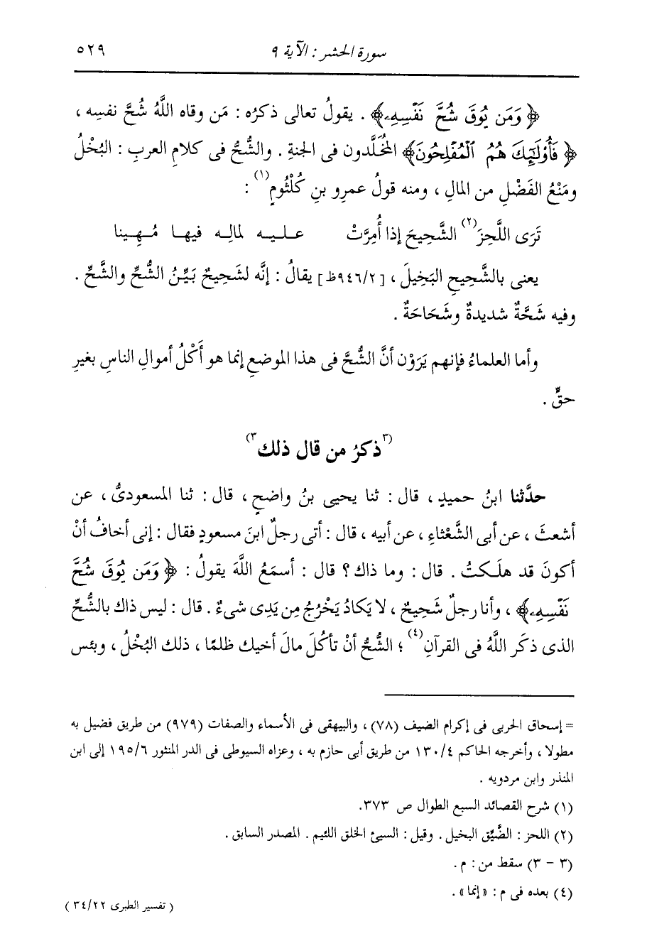حَدَّثَنَا ابْنُ حُمَيْدٍ، قَالَ: ثنا يَحْيَى بْنُ وَاضِحٍ، قَالَ: ثنا الْمَسْعُودِيُّ، عَنْ أَشْعَثَ بْنِ أَبِي الشَّعْثَاءِ، عَنْ أَبِيهِ، قَالَ: أَتَى رَجُلٌ ابْنَ مَسْعُودٍ فَقَالَ: إِنِّي أَخَافُ أَنْ أَكُونَ قَدْ هَلَكْتُ. قَالَ: وَمَا ذَاكَ؟ قَالَ: أَسْمَعُ اللَّهَ يَقُولُ: {وَمَنْ يُوقَ شُحَّ نَفْسِهِ} [الحشر: 9] وَأَنَا رَجُلٌ شَحِيحٌ لَا يَكَادُ يَخْرُجُ مِنْ يَدِي شَيْءٌ، قَالَ: لَيْسَ ذَاكَ بِالشُّحِّ الَّذِي ذَكَرَ اللَّهُ فِي الْقُرْآنِ، إِنَّمَا §الشُّحُّ أَنْ تَأَكُلَ مَالَ أَخِيكَ ظُلْمًا، ذَلِكَ الْبُخْلُ، وَبِئْسَ -[530]- الشَّيْءُ الْبُخْلُ
