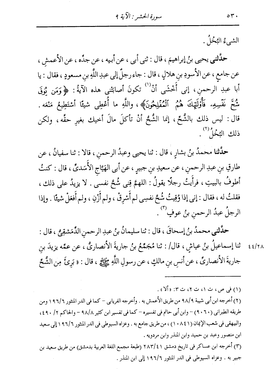 حَدَّثَنِي يَحْيَى بْنُ إِبْرَاهِيمَ، قَالَ: ثني أَبِي، عَنْ أَبِيهِ، عَنْ جَدِّهِ، عَنِ الْأَعْمَشِ، عَنْ جَامِعٍ، عَنِ الْأَسْوَدِ بْنِ هِلَالٍ، قَالَ: جَاءَ رَجُلٌ إِلَى عَبْدِ اللَّهِ بْنِ مَسْعُودٍ، فَقَالَ: يَا أَبَا عَبْدِ الرَّحْمَنِ، إِنِّي أَخْشَى أَنْ تَكُونَ أَصَابَتْنِي هَذِهِ الْآيَةُ {وَمَنْ يُوقَ شُحَّ نَفْسِهِ فَأُولَئِكَ هُمُ الْمُفْلِحُونَ} [الحشر: 9] وَاللَّهِ مَا أُعْطِي شَيْئًا أَسْتَطِيعُ مَنْعَهُ، قَالَ: لَيْسَ ذَلِكَ بِالشُّحِّ، إِنَّمَا §الشُّحُّ أَنْ تَأْكُلَ مَالَ أَخِيكَ بِغَيْرِ حَقِّهِ، وَلَكِنْ ذَلِكَ الْبُخْلُ