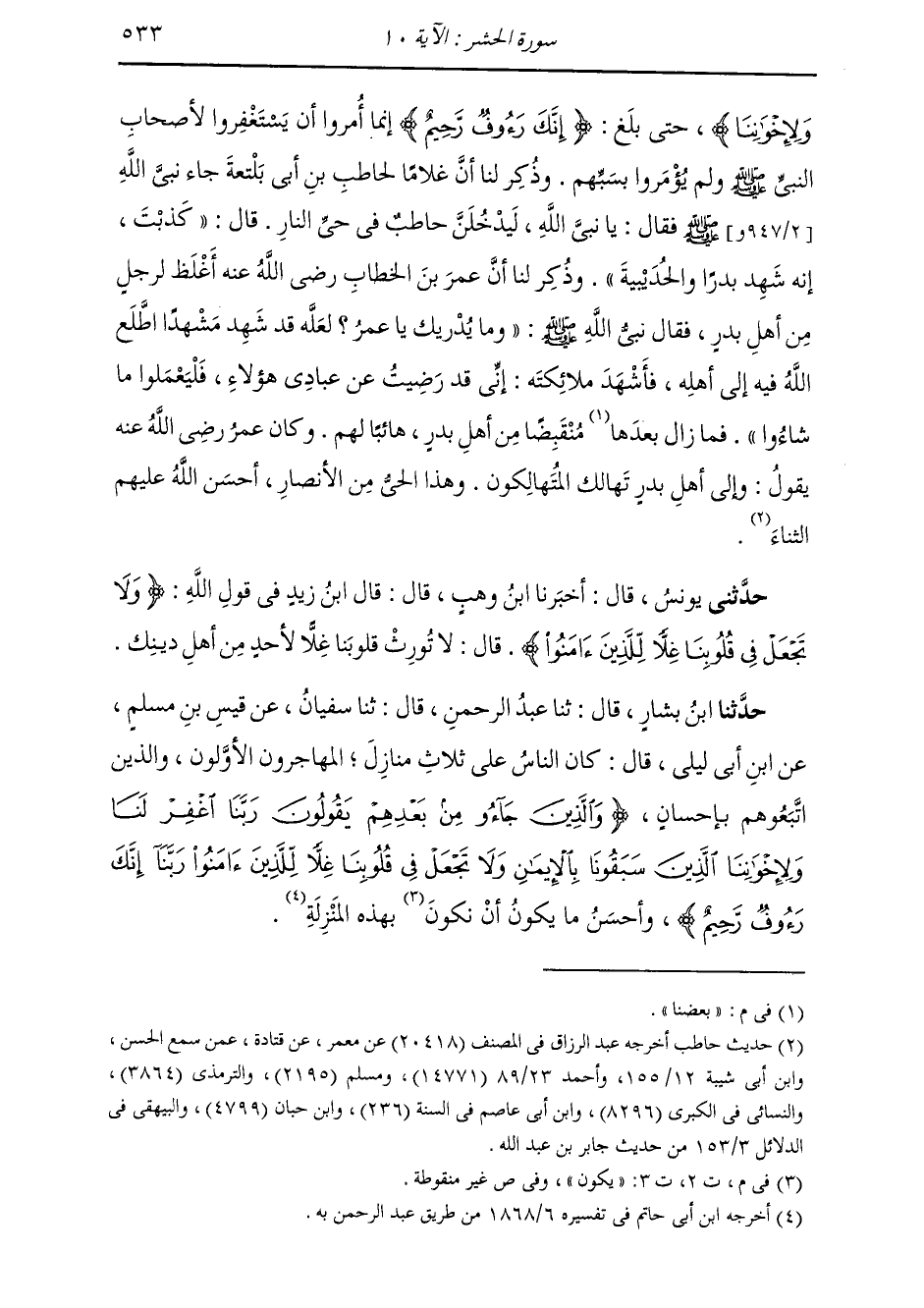 وَلِإِخْوَانِنَا} حَتَّى بَلَغَ {إِنَّكَ رَءُوفٌ رَحِيمٌ} إِنَّمَا أُمِرُوا أَنْ يَسْتَغْفِرُوا لِأَصْحَابِ النَّبِيِّ صَلَّى اللهُ عَلَيْهِ وَسَلَّمَ وَلَمْ يُؤْمَرُوا بِسَبِّهِمْ. وَذُكِرَ لَنَا أَنَّ غُلَامًا لِحَاطِبِ بْنِ أَبِي بَلْتَعَةَ جَاءَ نَبِيَّ اللَّهِ صَلَّى اللهُ عَلَيْهِ وَسَلَّمَ فَقَالَ: يَا نَبِيَّ اللَّهِ، لَيَدْخُلَنَّ حَاطِبٌ فِي حَرِّ النَّارِ. قَالَ: كَذَبْتَ، إِنَّهُ شَهِدَ بَدْرًا وَالْحُدَيْبِيَةَ ". وَذُكِرَ لَنَا أَنَّ عُمَرَ بْنَ الْخَطَّابِ رَضِيَ اللَّهُ عَنْهُ أَغْلَظَ لِرَجُلٍ مِنْ أَهْلِ بَدْرٍ، فَقَالَ نَبِيُّ اللَّهِ صَلَّى اللهُ عَلَيْهِ وَسَلَّمَ: «وَمَا يُدْرِيكَ يَا عُمَرُ لَعَلَّهُ قَدْ شَهِدَ مَشْهَدًا اطَّلَعَ اللَّهُ فِيهِ إِلَى أَهْلِهِ فَأَشْهَدَ مَلَائِكَتَهُ إِنِّي قَدْ رَضِيتُ عَنْ عِبَادِي هَؤُلَاءِ، فَلْيَعْمَلُوا مَا شَاءُوا» فَمَا زَالَ بَعْضُنَا مُنْقَبِضًا مِنْ أَهْلِ بَدْرٍ، هَائِبًا لَهُمْ. وَكَانَ عُمَرُ رَضِيَ اللَّهُ عَنْهُ يَقُولُ: وَإِلَى أَهْلِ بَدْرٍ تَهَالَكَ الْمُتَهَالِكُونَ، وَهَذَا الْحَيُّ مِنَ الْأَنْصَارِ، أَحْسَنَ اللَّهُ عَلَيْهِمُ الثَّنَاءَ