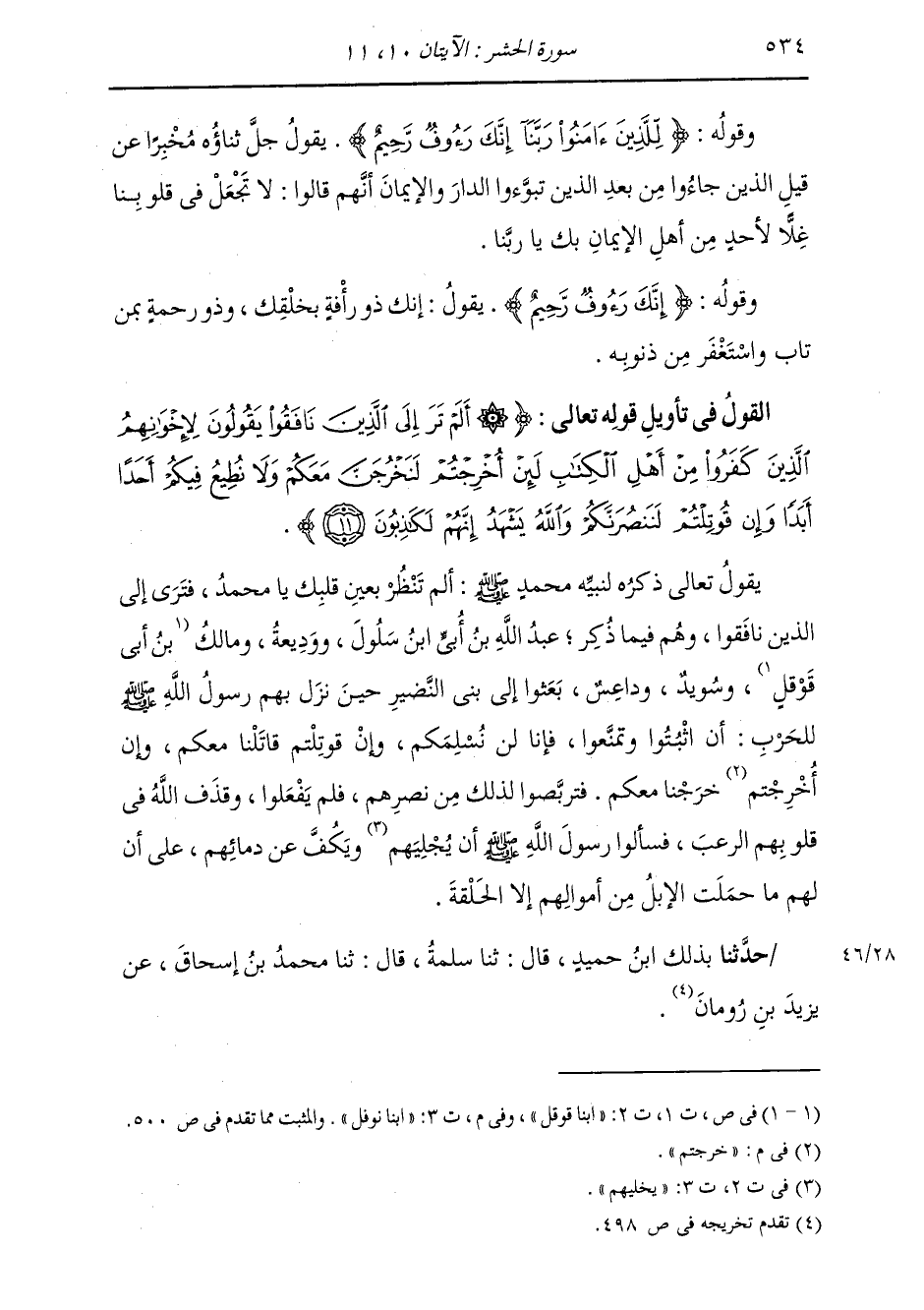 يَقُولُ تَعَالَى ذِكْرُهُ لِنَبِيِّهِ مُحَمَّدٍ صَلَّى اللهُ عَلَيْهِ وَسَلَّمَ: §أَلَمْ تَنْظُرْ بِعَيْنِ قَلْبِكَ يَا مُحَمَّدُ، فَتَرَى إِلَى الَّذِينَ نَافَقُوا , وَهُمْ فِيمَا ذُكِرَ عَبْدُ اللَّهِ بْنُ أُبَيِّ بْنِ سَلُولٍ، وَوَدِيعَةُ، وَمَالِكٌ ابْنَا نَوْفَلٍ وَسُوَيْدٌ وَدَاعِسٌ بَعَثُوا إِلَى بَنِي النَّضِيرِ حِينَ نَزَلَ بِهِمْ رَسُولُ اللَّهِ صَلَّى اللهُ عَلَيْهِ وَسَلَّمَ لِلْحَرْبِ أَنِ اثْبُتُوا وَتَمَنَّعُوا، فَإِنَّا لَنْ نُسْلِمَكُمْ، وَإِنْ قُوتِلْتُمْ قَاتَلْنَا مَعَكُمْ، وَإِنْ خَرَجْتُمْ، خَرَجْنَا مَعَكُمْ، فَتَرَبَّصُوا لِذَلِكَ مِنْ نَصْرِهِمْ، فَلَمْ يَفْعَلُوا، وَقَذَفَ اللَّهُ فِي قُلُوبِهِمُ الرُّعْبَ، فَسَأَلُوا رَسُولَ اللَّهِ صَلَّى اللهُ عَلَيْهِ وَسَلَّمَ أَنْ يُجْلِيَهُمُ، وَيَكُفُّ عَنْ دِمَائِهِمْ عَلَى أَنَّ لَهُمُ مَا حَمَلَتِ الْإِبِلُ مِنْ أَمْوَالِهِمْ إِلَّا الْحَلْقَةَ حَدَّثَنَا بِذَلِكَ ابْنُ حُمَيْدٍ، قَالَ: ثنا سَلَمَةُ، قَالَ: ثنا مُحَمَّدُ بْنُ إِسْحَاقَ، عَنْ يَزِيدَ بْنِ رُومَانَ