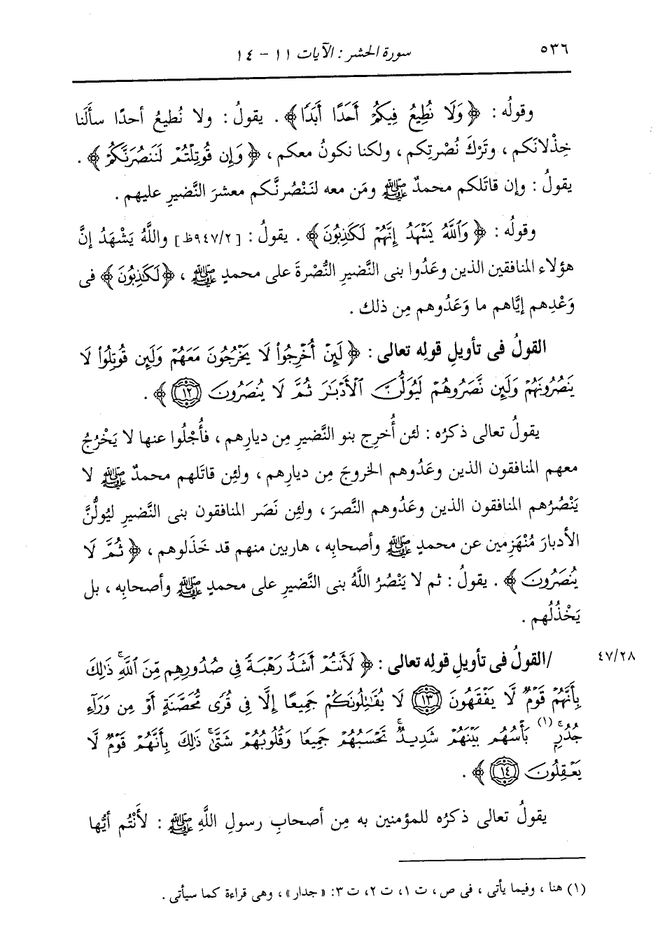 §الْقَوْلُ فِي تَأْوِيلِ قَوْلِهِ تَعَالَى: {لَئِنْ أُخْرِجُوا لَا يَخْرُجُونَ مَعَهُمْ وَلَئِنْ قُوتِلُوا لَا يَنصُرُونَهُمْ وَلَئِنْ نَصَرُوهُمْ لَيُوَلُّنَّ الْأَدْبَارَ ثُمَّ لَا يُنْصَرُونَ} [الحشر: 12] يَقُولُ تَعَالَى ذِكْرُهُ: لَئِنْ أُخْرِجَ بَنُو النَّضِيرِ مِنْ دِيَارِهِمْ، فَأُجْلُوا عَنْهَا لَا يَخْرُجُ مَعَهُمُ الْمُنَافِقُونَ الَّذِينَ وَعَدُوهُمُ الْخُرُوجَ مِنْ دِيَارِهِمْ، وَلَئِنْ قَاتَلَهُمْ مُحَمَّدٌ صَلَّى اللهُ عَلَيْهِ وَسَلَّمَ لَا يَنْصُرُهُمُ الْمُنَافِقُونَ الَّذِينَ وَعَدُوهُمُ النَّصْرَ، وَلَئِنْ نَصَرَ الْمُنَافِقُونَ بَنِي النَّضِيرِ لَيُوَلُّنَّ الْأَدْبَارَ مُنْهَزِمِينَ عَنْ مُحَمَّدٍ صَلَّى اللهُ عَلَيْهِ وَسَلَّمَ وَأَصْحَابِهِ هَارِبِينَ مِنْهُمْ، قَدْ خَذَلُوهُمْ. {ثُمَّ لَا يُنْصَرُونَ} [آل عمران: 111] يَقُولُ: ثُمَّ لَا يَنْصُرُ اللَّهُ بَنِي النَّضِيرِ عَلَى مُحَمَّدٍ صَلَّى اللهُ عَلَيْهِ وَسَلَّمَ وَأَصْحَابِهِ بَلْ يَخْذُلُهُمْ.