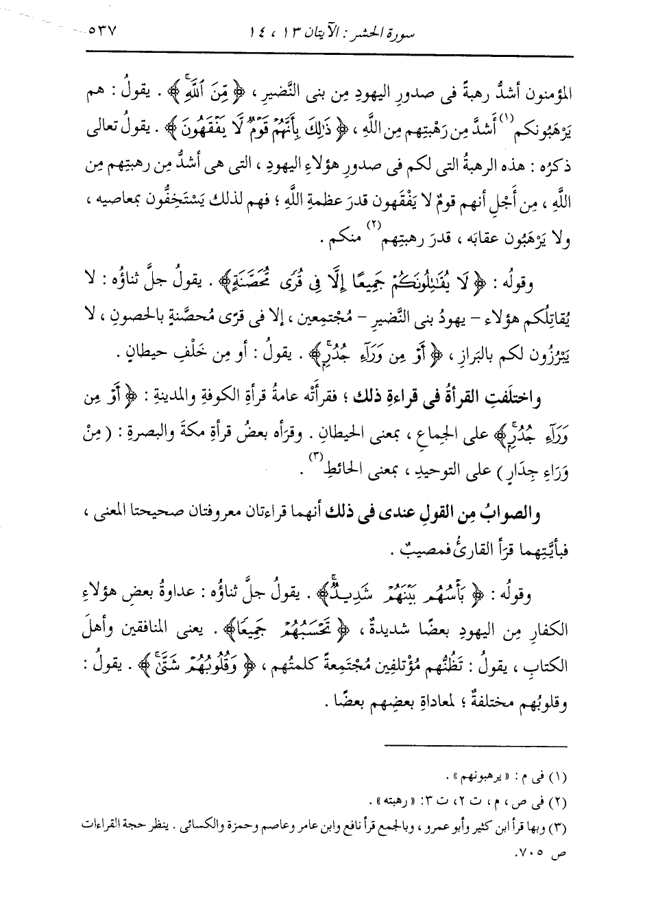 §وَقَوْلُهُ: لَا يُقَاتِلُونَكُمْ جَمِيعًا إِلَّا فِي قُرًى مُحُصَّنَةٍ يَقُولُ جَلَّ ثَنَاؤُهُ: لَا يُقَاتِلُكُمْ هَؤُلَاءِ الْيَهُودُ بَنُو النَّضِيرِ مُجْتَمِعِينَ إِلَّا فِي قُرًى مُحَصَّنَةٍ بِالْحُصُونِ، لَا يَبْرُزُونَ لَكُمْ بِالْبَرَازِ، أَوْ مِنْ وَرَاءِ جِدَارٍ يَقُولُ: أَوْ مِنْ خَلْفِ حِيطَانَ. وَاخْتَلَفَتِ الْقُرَّاءُ فِي قِرَاءَةِ ذَلِكَ، فَقَرَأَتْهُ عَامَّةُ قُرَّاءِ الْكُوفَةِ وَالْمَدِينَةِ أَوْ مِنْ وَرَاءِ جُدُرٍ عَلَى الْجِمَاعِ بِمَعْنَى الْحِيطَانِ. وَقَرَأَهُ بَعْضُ قُرَّاءِ مَكَّةَ وَالْبَصْرَةِ: (مِنْ وَرَاءِ جِدَارٍ) عَلَى التَّوْحِيدِ بِمَعْنَى الْحَائِطِ. وَالصَّوَابُ مِنَ الْقَوْلِ عِنْدِي فِي ذَلِكَ أَنَّهُمَا قِرَاءَتَانِ مَعْرُوفَتَانِ صَحِيحَتَانِ الْمَعْنَى، فَبِأَيَّتِهِمَا قَرَأَ الْقَارِئُ فَمُصِيبٌ.