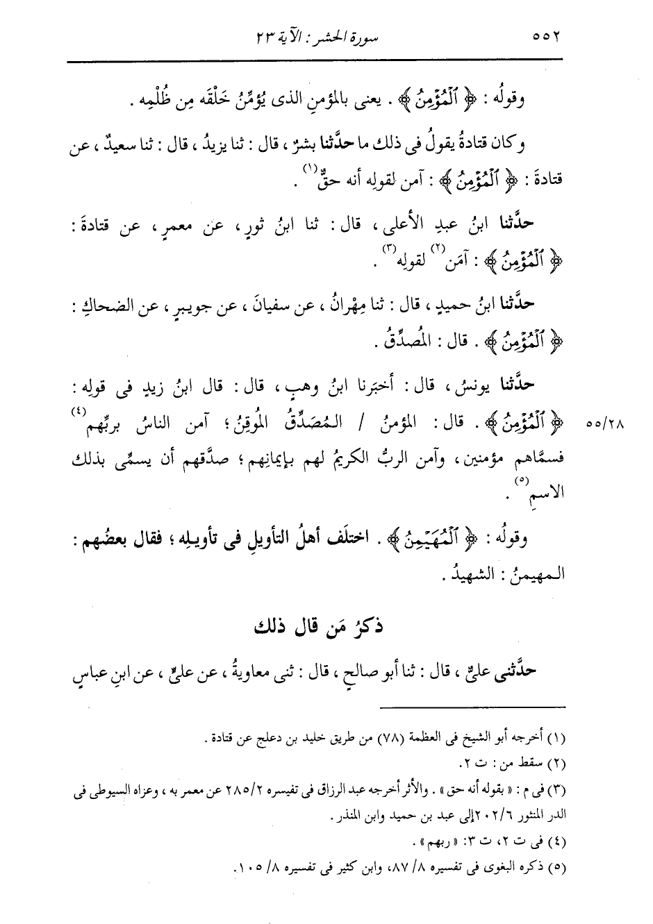 حَدَّثَنَا ابْنُ عَبْدِ الْأَعْلَى، قَالَ: ثنا ابْنُ ثَوْرٍ، عَنْ مَعْمَرٍ، عَنْ قَتَادَةَ {§الْمُؤْمِنُ} [الحشر: 23] أَمِنَ بِقَوْلِهِ أَنَّهُ حَقٌّ