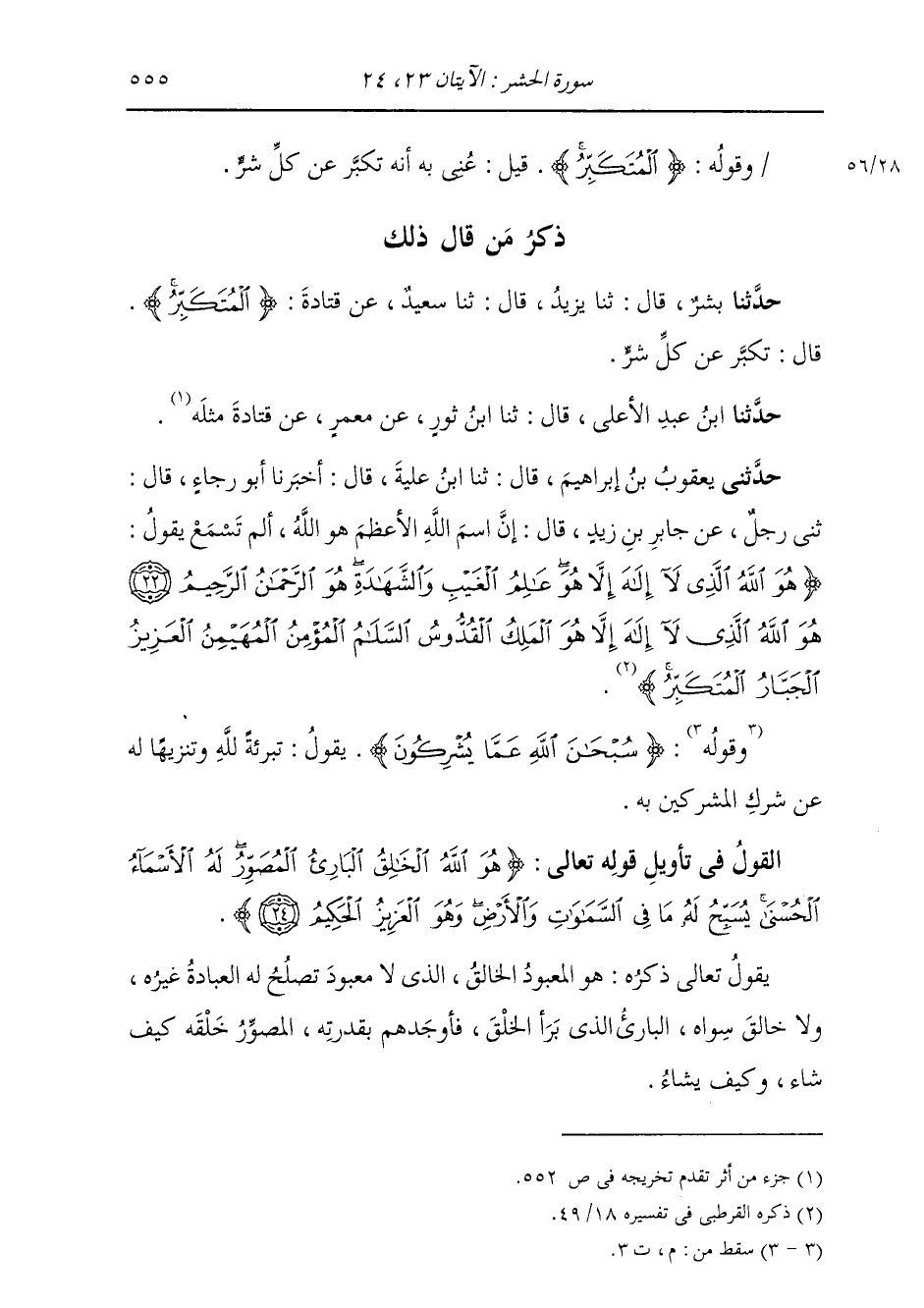 ذِكْرُ مَنْ قَالَ ذَلِكَ حَدَّثَنَا بِشْرٌ، قَالَ: ثنا يَزِيدُ، قَالَ: ثنا سَعِيدٌ، عَنْ قَتَادَةَ، {§الْمُتَكَبِّرُ} [الحشر: 23] قَالَ: تَكَبَّرَ عَنْ كُلِّ شَرٍّ. حَدَّثَنَا ابْنُ عَبْدِ الْأَعْلَى، قَالَ: ثنا ابْنُ ثَوْرٍ، عَنْ مَعْمَرٍ، عَنْ قَتَادَةَ، مِثْلَهُ