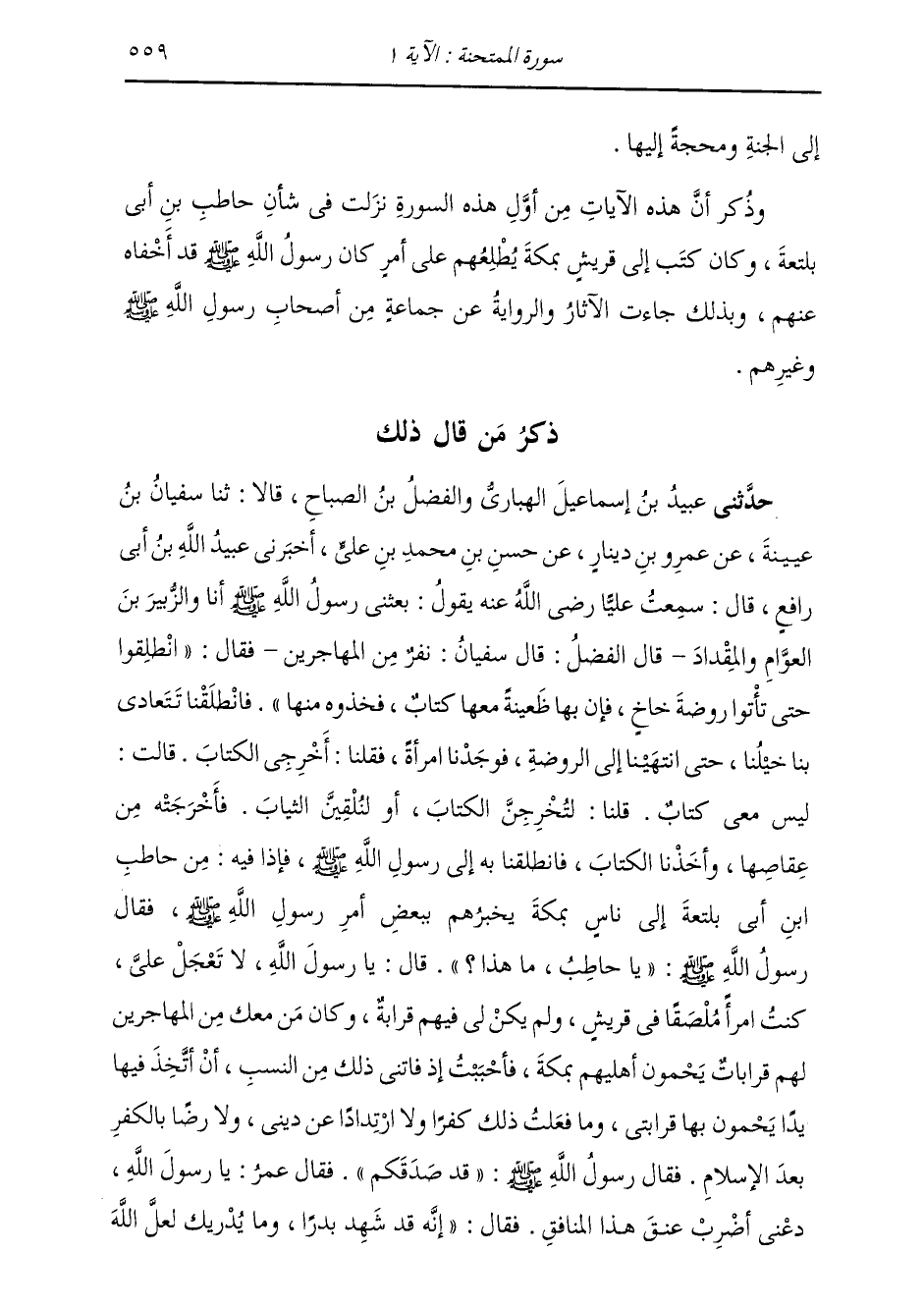 ذِكْرُ مَنْ قَالَ ذَلِكَ حَدَّثَنِي عُبَيْدُ بْنُ إِسْمَاعِيلَ الْهَبَّارِيُّ وَالْفَضْلُ بْنُ الصَّبَّاحِ، قَالَا: ثنا سُفْيَانُ بْنُ عُيَيْنَةَ، عَنْ عَمْرِو بْنِ دِينَارٍ، عَنْ حَسَنِ بْنِ مُحَمَّدِ بْنِ عَلِيٍّ، أَخْبَرَنِي عُبَيْدُ اللَّهِ بْنُ أَبِي رَافِعٍ، قَالَ: سَمِعْتُ عَلِيًّا، رَضِيَ اللَّهُ عَنْهُ يَقُولُ: بَعَثَنِي رَسُولُ اللَّهِ صَلَّى اللهُ عَلَيْهِ وَسَلَّمَ أَنَا وَالزُّبَيْرَ بْنَ الْعَوَّامِ وَالْمِقْدَادَ، قَالَ الْفَضْلُ؛ قَالَ سُفْيَانُ: نَفَرٌ مِنَ الْمُهَاجِرِينَ فَقَالَ: «انْطَلِقُوا حَتَّى تَأْتُوا رَوْضَةَ خَاخٍ، فَإِنَّ §بِهَا ظَعِينَةً مَعَهَا كِتَابٌ، فَخُذُوهُ مِنْهَا» . فَانْطَلَقْنَا تَتَعَادَى بِنَا خَيْلُنَا حَتَّى انْتَهَيْنَا إِلَى الرَّوْضَةِ، فَوَجَدْنَا امْرَأَةً، فَقُلْنَا: أَخْرِجِي الْكِتَابَ، قَالَتْ: لَيْسَ مَعِي كِتَابٌ، قُلْنَا: لَتُخْرِجِنَّ الْكِتَابَ، أَوْ لَنُلْقِيَنَّ الثِّيَابَ، فَأَخْرَجَتْهُ مِنْ عِقَاصِهَا، وَأَخَذْنَا الْكِتَابَ؛ فَانْطَلَقْنَا بِهِ إِلَى رَسُولِ اللَّهِ صَلَّى اللهُ عَلَيْهِ وَسَلَّمَ، فَإِذَا فِيهِ: مِنْ حَاطِبِ بْنِ أَبِي بَلْتَعَةَ إِلَى نَاسٍ بِمَكَّةَ، يُخْبِرُهُمْ بِبَعْضِ أَمْرِ رَسُولِ اللَّهِ صَلَّى اللهُ عَلَيْهِ وَسَلَّمَ. فَقَالَ رَسُولُ اللَّهِ صَلَّى اللهُ عَلَيْهِ وَسَلَّمَ: «يَا حَاطِبُ مَا هَذَا؟» قَالَ: يَا رَسُولَ اللَّهِ لَا تَعْجَلْ عَلَيَّ؛ كُنْتُ امْرَأً مُلْصَقًا فِي قُرَيْشٍ، وَلَمْ يَكُنْ لِي فِيهِمْ قَرَابَةٌ، وَكَانَ مَنْ مَعَكَ مِنَ الْمُهَاجِرِينَ لَهُمْ قَرَابَاتٌ، يَحْمُونَ أَهْلِيهِمْ بِمَكَّةَ، فَأَحْبَبْتُ إِذْ فَاتَنِي ذَلِكَ مِنَ النَّسَبِ أَنْ أَتَّخِذَ فِيهَا يَدًا يَحْمُونَ بِهَا قَرَابَتِي، وَمَا فَعَلْتُ ذَلِكَ كُفْرًا وَلَا ارْتِدَادًا عَنْ دِينِي، وَلَا رِضًا بِالْكُفْرِ بَعْدَ الْإِسْلَامِ، فَقَالَ رَسُولُ اللَّهِ صَلَّى اللهُ عَلَيْهِ وَسَلَّمَ: «قَدْ صَدَقَكُمْ» . فَقَالَ عُمَرُ: يَا رَسُولَ اللَّهِ، دَعْنِي أَضْرِبْ عُنُقَ هَذَا الْمُنَافِقِ. فَقَالَ: " إِنَّهُ قَدْ شَهِدَ بَدْرًا، وَمَا يُدْرِيكَ لَعَلَّ اللَّهَ -[560]- قَدِ اطَّلَعَ عَلَى أَهْلِ بَدْرٍ فَقَالَ: اعْمَلُوا مَا شِئْتُمْ فَقَدْ غَفَرْتُ لَكُمْ ". زَادَ الْفَضْلُ فِي حَدِيثِهِ، قَالَ سُفْيَانُ: وَنَزَلَتْ فِيهِ {يَا أَيُّهَا الَّذِينَ آمَنُوا لَا تَتَّخِذُوا عَدُوِّي وَعَدُوَّكُمْ أَوْلِيَاءَ} [الممتحنة: 1] إِلَى قَوْلِهِ: {حَتَّى تُؤْمِنُوا بِاللَّهِ وَحْدَهُ} [الممتحنة: 4]