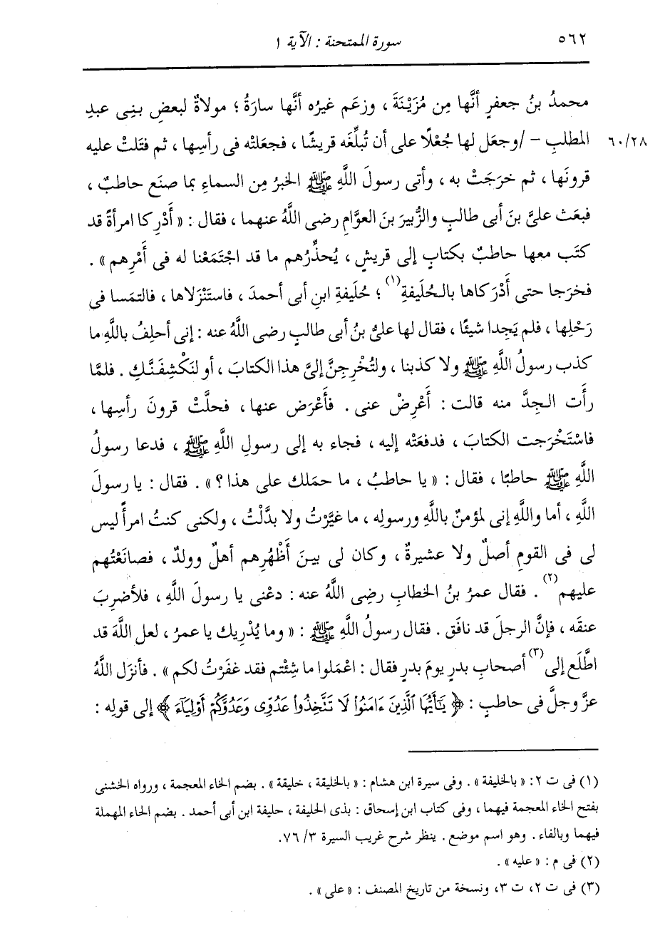 مُحَمَّدُ بْنُ جَعْفَرٍ أَنَّهَا مِنْ مُزَيْنَةَ، وَزَعَمَ غَيْرُهُ أَنَّهَا سَارَّةُ مَوْلَاةٌ لِبَعْضِ بَنِي عَبْدِ الْمُطَّلِبِ وَجَعَلَ لَهَا جُعْلًا، عَلَى أَنْ تُبْلِغَهُ قُرَيْشًا، فَجَعَلَتْهُ فِي رَأْسِهَا. ثُمَّ فَتَلَتْ عَلَيْهِ قُرُونَهَا، ثُمَّ خَرَجَتْ. وَأَتَى رَسُولَ اللَّهِ صَلَّى اللهُ عَلَيْهِ وَسَلَّمَ الْخَبَرُ مِنَ السَّمَاءِ بِمَا صَنَعَ حَاطِبٌ، فَبَعَثَ عَلِيَّ بْنَ أَبِي طَالِبٍ وَالزُّبَيْرَ بْنَ الْعَوَّامِ رَضِيَ اللَّهُ عَنْهُمَا، فَقَالَ: «أَدْرِكَا امْرَأَةً قَدْ كَتَبَ مَعَهَا حَاطِبٌ بِكِتَابٍ إِلَى قُرَيْشٍ يُحَذِّرُهُمْ مَا قَدِ اجْتَمَعْنَا لَهُ فِي أَمْرِهِمْ» . فَخَرَجَا حَتَّى أَدْرَكَاهَا بِالْحُلَيْفَةِ حُلَيْفَةِ ابْنِ أَبِي أَحْمَدَ فَاسْتَنْزَلَاهَا فَالْتَمَسَا فِي رَحْلِهَا، فَلَمْ يَجِدَا شَيْئًا، فَقَالَ لَهَا عَلِيُّ بْنُ أَبِي طَالِبٍ رَضِيَ اللَّهُ عَنْهُ: إِنِّي أَحْلِفُ بِاللَّهِ مَا كَذَبَ رَسُولُ اللَّهِ صَلَّى اللهُ عَلَيْهِ وَسَلَّمَ وَلَا كَذَبَنَا، وَلَتُخْرِجِنَّ إِلَيَّ هَذَا الْكِتَابَ، أَوْ لَنَكْشِفَنَّكِ؛ فَلَمَّا رَأَتِ الْجِدَّ مِنْهُ، قَالَتْ: أَعْرِضْ عَنِّي، فَأَعْرَضَ عَنْهَا، فَحَلَّتْ قُرُونَ رَأْسِهَا، فَاسْتَخْرَجَتِ الْكِتَابَ فَدَفَعَتْهُ إِلَيْهِ فَجَاءَ بِهِ إِلَى رَسُولِ اللَّهِ صَلَّى اللهُ عَلَيْهِ وَسَلَّمَ فَدَعَا رَسُولَ اللَّهِ صَلَّى اللهُ عَلَيْهِ وَسَلَّمَ حَاطِبًا، فَقَالَ: «يَا حَاطِبُ مَا حَمَلَكَ عَلَى هَذَا؟» فَقَالَ: يَا رَسُولَ اللَّهِ، أَمَا وَاللَّهِ إِنِّي لِمُؤْمِنٍ بِاللَّهِ وَرَسُولِهِ، مَا غَيَّرْتُ وَلَا بَدَّلْتُ، وَلَكِنِّي كُنْتُ امْرَأً فِي الْقَوْمِ لَيْسَ لِي أَصْلٌ وَلَا عَشِيرَةٌ، وَكَانَ لِي بَيْنَ أَظْهُرِهِمْ أَهْلٌ وَوَلَدٌ، فَصَانَعْتُهُمْ عَلَيْهِ. فَقَالَ عُمَرُ بْنُ الْخَطَّابِ رَضِيَ اللَّهُ عَنْهُ: دَعْنِي يَا رَسُولَ اللَّهِ فَلْأَضْرِبْ عُنُقَهُ، فَإِنَّ الرَّجُلَ قَدْ نَافَقَ. فَقَالَ رَسُولُ اللَّهِ صَلَّى اللهُ عَلَيْهِ وَسَلَّمَ: " وَمَا يُدْرِيكَ يَا عُمَرُ §لَعَلَّ اللَّهَ قَدِ اطَّلَعَ عَلَى أَصْحَابِ بَدْرٍ يَوْمَ بَدْرٍ فَقَالَ: اعْمَلُوا مَا شِئْتُمْ فَقَدْ غَفَرْتُ لَكُمْ " فَأَنْزَلَ اللَّهُ عَزَّ وَجَلَّ فِي حَاطِبٍ {يَا أَيُّهَا الَّذِينَ آمَنُوا لَا تَتَّخِذُوا عَدُوِّي وَعَدُوَّكُمْ أَوْلِيَاءَ} [الممتحنة: 1] إِلَى قَوْلِهِ