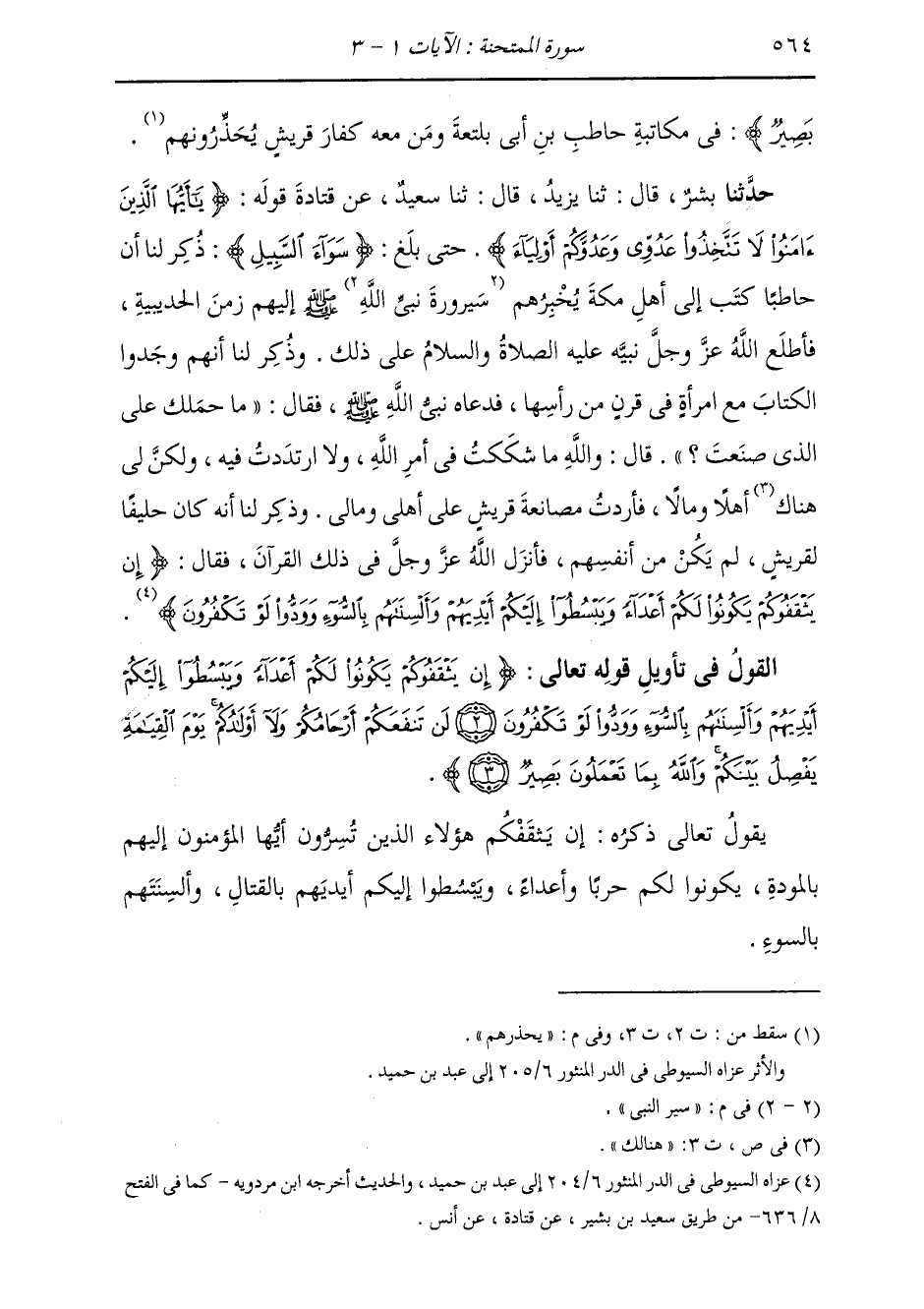 حَدَّثَنَا بِشْرٌ، قَالَ: ثنا يَزِيدُ، قَالَ: ثنا سَعِيدٌ، عَنْ قَتَادَةَ، قَوْلُهُ: {يَا أَيُّهَا الَّذِينَ آمَنُوا لَا تَتَّخِذُوا عَدُوِّي وَعَدُوَّكُمْ أَوْلِيَاءَ} [الممتحنة: 1] حَتَّى بَلَغَ {سَوَاءَ السَّبِيلِ} [البقرة: 108] : ذُكِرَ لَنَا أَنَّ حَاطِبًا كَتَبَ إِلَى أَهْلِ مَكَّةَ يُخْبِرُهُمْ سَيْرَ النَّبِيِّ صَلَّى اللهُ عَلَيْهِ وَسَلَّمَ إِلَيْهِمْ زَمَنَ الْحُدَيْبِيَةِ، فَأَطْلَعَ اللَّهُ عَزَّ وَجَلَّ نَبِيَّهُ عَلَيْهِ الصَّلَاةُ وَالسَّلَامُ عَلَى ذَلِكَ، وَذُكِرَ لَنَا أَنَّهُمْ وَجَدُوا الْكِتَابَ مَعَ امْرَأَةٍ فِي قَرْنٍ مِنْ رَأْسِهَا، فَدَعَاهُ نَبِيُّ اللَّهِ صَلَّى اللهُ عَلَيْهِ وَسَلَّمَ فَقَالَ: «§مَا حَمَلَكَ عَلَى الَّذِي صَنَعْتَ؟» قَالَ: وَاللَّهِ مَا شَكَكْتُ فِي أَمْرِ اللَّهِ، وَلَا ارْتَدَدْتُ فِيهِ، وَلَكِنَّ لِي هُنَاكَ أَهْلًا وَمَالًا، فَأَرَدْتُ مُصَانَعَةَ قُرَيْشٍ عَلَى أَهْلِي وَمَالِي. وَذُكِرَ لَنَا أَنَّهُ كَانَ حَلِيفًا لِقُرَيْشٍ لَمْ يَكُنْ مِنْ أَنْفُسِهِمْ، فَأَنْزَلَ اللَّهُ عَزَّ وَجَلَّ فِي ذَلِكَ الْقُرْآنَ، فَقَالَ: {إِنْ يَثْقَفُوكُمْ يَكُونُوا لَكُمْ أَعْدَاءً وَيَبْسُطُوا إِلَيْكُمْ أَيْدِيَهُمْ وَأَلْسِنَتَهُمْ بِالسُّوءِ وَوَدُّوا لَوْ تَكْفُرُونَ} [الممتحنة: 2]