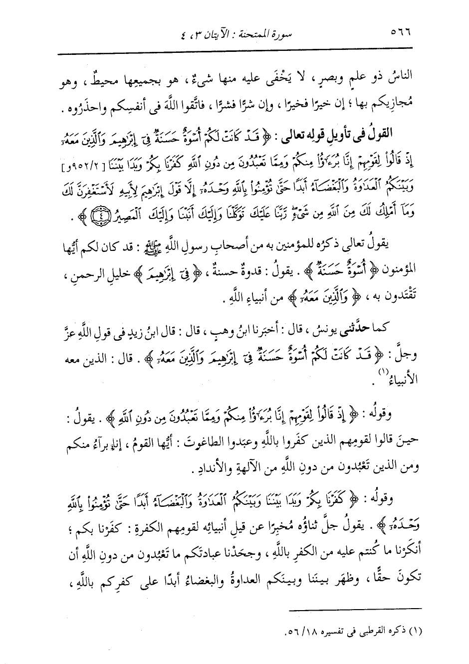 §الْقَوْلُ فِي تَأْوِيلِ قَوْلِهِ تَعَالَى: {قَدْ كَانَتْ لَكُمْ أُسْوَةٌ حَسَنَةٌ فِي إِبْرَاهِيمَ وَالَّذِينَ مَعَهُ إِذْ قَالُوا لِقَوْمِهِمْ إِنَّا بُرَآءُ مِنْكُمْ وَمِمَّا تَعْبُدُونَ مِنْ دُونِ اللَّهِ كَفَرْنَا بِكُمْ وَبَدَا بَيْنَنَا وَبَيْنَكُمُ الْعَدَاوَةُ وَالْبَغْضَاءُ أَبَدًا حَتَّى تُؤْمِنُوا بِاللَّهِ وَحْدَهُ إِلَّا قَوْلَ إِبْرَاهِيمَ لِأَبِيهِ لَأَسْتَغْفِرَنَّ لَكَ وَمَا أَمْلِكُ لَكَ مِنَ اللَّهِ مِنْ شَيْءٍ رَّبَّنَا عَلَيْكَ تَوَكَّلْنَا وَإِلَيْكَ أَنَبْنَا وَإِلَيْكَ الْمَصِيرُ} يَقُولُ تَعَالَى ذِكْرُهُ لِلْمُؤْمِنِينَ بِهِ مِنْ أَصْحَابِ رَسُولِ اللَّهِ صَلَّى اللهُ عَلَيْهِ وَسَلَّمَ: قَدْ كَانَ لَكُمْ أَيُّهَا الْمُؤْمِنُونَ أُسْوَةٌ حَسَنَةٌ: يَقُولُ: قُدْوَةٌ حَسَنَةٌ فِي إِبْرَاهِيمَ خَلِيلِ الرَّحْمَنِ، تَقْتَدُونَ بِهِ، وَالَّذِينَ مَعَهُ مِنْ أَنْبِيَاءِ اللَّهِ.