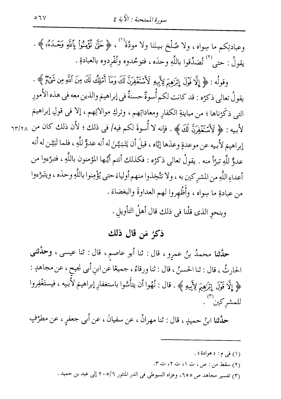 ذِكْرُ مَنْ قَالَ ذَلِكَ حَدَّثَنَا مُحَمَّدُ بْنُ عَمْرٍو، قَالَ: ثنا أَبُو عَاصِمٍ، قَالَ: ثنا عِيسَى، وَحدَّثَنِي الْحَارِثُ، قَالَ: ثنا الْحَسَنُ، قَالَ: ثنا وَرْقَاءُ، جَمِيعًا، عَنِ ابْنِ أَبِي نَجِيحٍ، عَنْ مُجَاهِدٍ، {إِلَّا قَوْلَ إِبْرَاهِيمَ لِأَبِيهِ} [الممتحنة: 4] قَالَ: §نُهُوا أَنْ يَتَأَسَوْا بِاسْتِغْفَارِ إِبْرَاهِيمَ لِأَبِيهِ، فَيَسْتَغْفِرُوا لِلْمُشْرِكِينَ