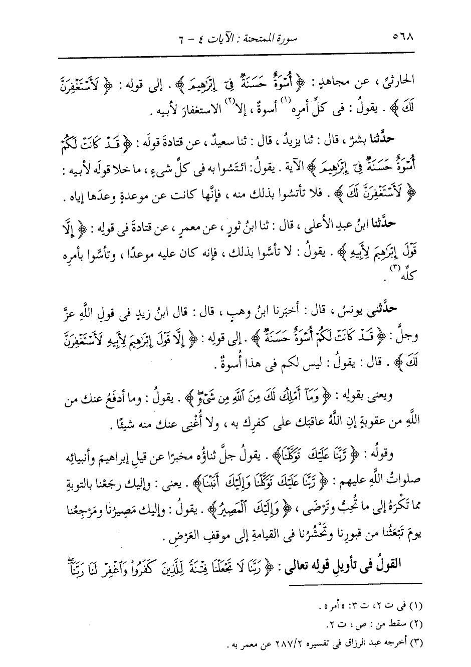 §الْقَوْلُ فِي تَأْوِيلِ قَوْلِهِ تَعَالَى: {رَبَّنَا لَا تَجْعَلْنَا فِتْنَةً لِلَّذِينَ كَفَرُوا وَاغْفِرْ لَنَا رَبَّنَا -[569]- إِنَّكَ أَنتَ الْعَزِيزُ الْحَكِيمُ لَقَدْ كَانَ لَكُمْ فِيهِمْ أُسْوَةٌ حَسَنَةٌ لِّمَنْ كَانَ يَرْجُو اللَّهَ وَالْيَوْمَ الآَخِرَ وَمَن يَتَوَلَّ فَإِنَّ اللَّهَ هُوَ الْغَنِيُّ الْحَمِيدُ} [الممتحنة: 6] يَقُولُ تَعَالَى ذِكْرُهُ مُخْبِرًا عَنْ قِيلَ إِبْرَاهِيمَ خَلِيلِهِ وَالَّذِينَ مَعَهُ: يَا رَبَّنَا لَا تَجْعَلْنَا فِتْنَةً لِلَّذِينَ كَفَرُوا بِكَ فَجَحَدُوا وَحْدَانِيَّتَكَ، وَعَبَدُوا غَيْرَكَ، بِأَنْ تُسَلِّطَهُمْ عَلَيْنَا، فَيَرَوْا أَنَّهُمْ عَلَى حَقٍّ، وَأَنَا عَلَى بَاطِلٍ، فَتَجْعَلُنَا بِذَلِكَ فِتْنَةً لَهُمْ. وَبِنَحْوِ الَّذِي قُلْنَا فِي ذَلِكَ قَالَ أَهْلُ التَّأْوِيلِ.