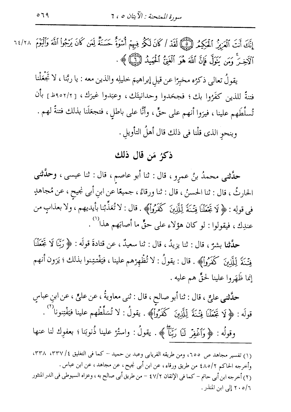ذِكْرُ مَنْ قَالَ ذَلِكَ حَدَّثَنِي مُحَمَّدُ بْنُ عَمْرٍو، قَالَ: ثنا أَبُو عَاصِمٍ، قَالَ: ثنا عِيسَى، وَحَدَّثَنِي الْحَارِثُ، قَالَ: ثنا الْحَسَنُ، قَالَ: ثنا وَرْقَاءُ، جَمِيعًا عَنِ ابْنِ أَبِي نَجِيحٍ، عَنْ مُجَاهِدٍ، فِي قَوْلِهِ: {لَا تَجْعَلْنَا فِتْنَةً لِلَّذِينَ كَفَرُوا} [الممتحنة: 5] قَالَ: §لَا تُعَذِّبْنَا بِأَيْدِيهِمْ، وَلَا بِعَذَابٍ مِنْ عِنْدَكَ، فَيَقُولُوا: لَوْ كَانَ هَؤُلَاءِ عَلَى حَقٍّ مَا أَصَابَهُمْ هَذَا