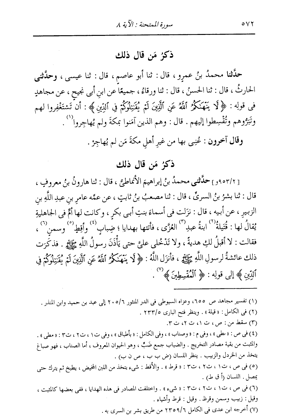 ذِكْرُ مَنْ قَالَ ذَلِكَ حَدَّثَنِي مُحَمَّدُ بْنُ إِبْرَاهِيمَ الْأَنْمَاطِيُّ، قَالَ: ثنا هَارُونُ بْنُ مَعْرُوفٍ، قَالَ: ثنا بِشْرُ بْنُ السَّرِيِّ، قَالَ: ثنا مُصْعَبُ بْنُ ثَابِتٍ، عَنْ عَمِّهِ عَامِرِ بْنِ عَبْدِ اللَّهِ بْنِ الزُّبَيْرِ، عَنْ أَبِيهِ، قَالَ: §نَزَلَتْ فِي أَسْمَاءَ بِنْتِ أَبِي بَكْرٍ، وَكَانَتْ لَهَا أُمٌّ فِي الْجَاهِلِيَّةِ يُقَالَ لَهَا قُتَيْلَةُ ابْنَةُ عَبْدِ الْعُزَّى، فَأَتَتْهَا بِهَدَايَا وَصِنَابٍ وَأَقِطٍ وَسَمْنٍ، فَقَالَتْ: لَا أَقْبَلُ لَكِ هَدِيَّةً، وَلَا تُدْخِلِي عَلَيَّ حَتَّى يَأْذَنَ رَسُولُ اللَّهِ صَلَّى اللهُ عَلَيْهِ وَسَلَّمَ فَذَكَرَتْ ذَلِكَ عَائِشَةُ لِرَسُولِ اللَّهِ صَلَّى اللهُ عَلَيْهِ وَسَلَّمَ، فَأَنْزَلَ اللَّهُ {لَا يَنْهَاكُمُ اللَّهُ عَنِ الَّذِينَ لَمْ يُقَاتِلُوكُمْ فِي الدِّينِ} [الممتحنة: 8] إِلَى قَوْلِهِ: {الْمُقْسِطِينَ} [الممتحنة: 8] .