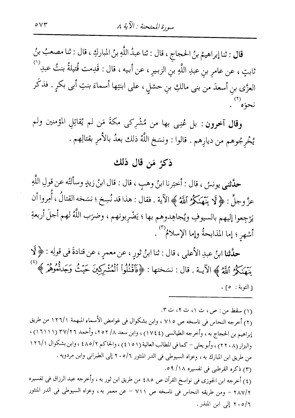 قَالَ ثنا إِبْرَاهِيمُ بْنُ الْحَجَّاجِ، قَالَ: ثنا عَبْدُ اللَّهِ بْنُ الْمُبَارَكِ، قَالَ: ثنا مُصْعَبُ بْنُ ثَابِتٍ، عَنْ عَامِرِ بْنِ عَبْدِ اللَّهِ بْنِ الزُّبَيْرِ، عَنْ أَبِيهِ، قَالَ: قَدِمَتْ قُتَيْلَةُ بِنْتُ عَبْدِ الْعُزَّى بْنِ سَعْدٍ مِنْ بَنِي مَالِكِ بْنِ حِسْلٍ عَلَى ابْنَتِهَا أَسْمَاءَ بِنْتِ أَبِي بَكْرٍ، فَذَكَرَ نَحْوَهُ وَقَالَ آخَرُونَ: بَلْ عُنِيَ بِهَا مِنْ مُشْرِكِي مَكَّةَ مَنْ لَمْ يُقَاتِلِ الْمُؤْمِنِينَ، وَلَمْ يُخْرِجُوهُمْ مِنْ دِيَارِهِمْ؛ قَالَ: وَنَسَخَ اللَّهُ ذَلِكَ بَعْدُ بِالْأَمْرِ بِقِتَالِهِمْ