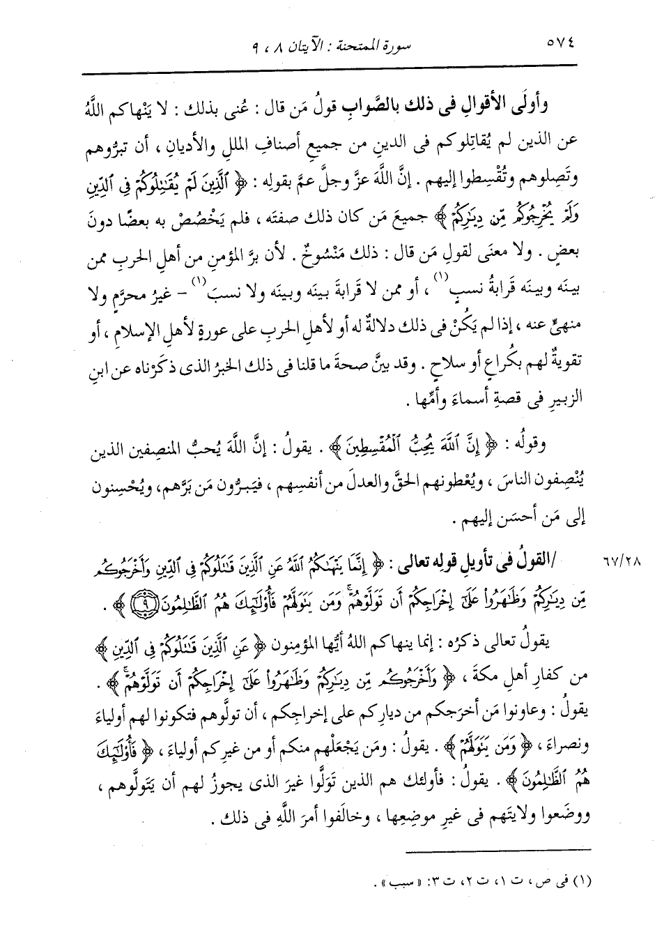§الْقَوْلُ فِي تَأْوِيلِ قَوْلِهِ تَعَالَى: {إِنَّمَا يَنْهَاكُمُ اللَّهُ عَنِ الَّذِينَ قَاتَلُوكُمْ فِي الدِّينِ وَأَخْرَجُوكُمْ مِنْ دِيَارِكُمْ وَظَاهَرُوا عَلَى إِخْرَاجِكُمْ أَنْ تَوَلَّوْهُمْ وَمَنْ يَتَوَلَّهُمْ فَأُولَئِكَ هُمُ الظَّالِمُونَ} [الممتحنة: 9] يَقُولُ تَعَالَى ذِكْرُهُ: {إِنَّمَا يَنْهَاكُمُ اللَّهُ} [الممتحنة: 9] أَيُّهَا الْمُؤْمِنُونَ {عَنِ الَّذِينَ قَاتَلُوكُمْ فِي الدِّينِ} [الممتحنة: 9] مِنْ كُفَّارِ أَهْلِ مَكَّةَ {وَأَخْرَجُوكُمْ مِنْ دِيَارِكُمْ وَظَاهَرُوا عَلَى إِخْرَاجِكُمْ أَنْ تَوَلَّوْهُمْ} [الممتحنة: 9] يَقُولُ: وَعَاوَنُوا مَنْ أَخْرَجَكُمْ مِنْ دِيَارِكُمْ عَلَى إِخْرَاجِكُمْ {أَنْ تَوَلَّوْهُمْ} [الممتحنة: 9] فَتَكُونُوا لَهُمْ أَوْلِيَاءَ وَنُصَرَاءَ