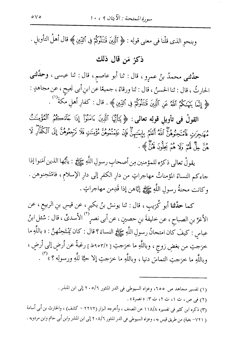 كَمَا: حَدَّثَنَا أَبُو كُرَيْبٍ، قَالَ: ثنا يُونُسُ بْنُ بُكَيْرٍ، عَنْ قَيْسِ بْنِ الرَّبِيعِ، عَنِ الْأَغَرِّ بْنِ الصَّبَّاحِ، عَنْ خَلِيفَةَ بْنِ حُصَيْنٍ، عَنْ أَبِي نَصْرٍ الْأَسَدِيِّ، قَالَ: سُئِلَ ابْنُ عَبَّاسٍ: كَيْفَ كَانَ امْتِحَانُ رَسُولِ اللَّهِ صَلَّى اللهُ عَلَيْهِ وَسَلَّمَ النِّسَاءَ؟ قَالَ: كَانَ §يَمْتَحِنُهُنَّ بِاللَّهِ مَا خَرَجْتُ مِنْ بُغْضِ زَوْجٍ، وَبِاللَّهِ مَا خَرَجْتُ رَغْبَةً عَنْ أَرْضٍ إِلَى أَرْضٍ، وَبِاللَّهِ مَا خَرَجْتُ الْتِمَاسَ دُنْيَا، وَبِاللَّهِ مَا خَرَجْتُ إِلَّا حُبًّا لِلَّهِ وَرَسُولِهِ. -[576]- حَدَّثَنَا أَبُو كُرَيْبٍ، قَالَ: ثنا الْحَسَنُ بْنُ عَطِيَّةَ، عَنْ قَيْسٍ، قَالَ: أَخْبَرَنَا الْأَغَرُّ بْنُ الصَّبَّاحِ، عَنْ خَلِيفَةَ بْنِ حُصَيْنٍ، عَنْ أَبِي نَصْرٍ، عَنِ ابْنِ عَبَّاسٍ فِي {يَا أَيُّهَا الَّذِينَ آمَنُوا إِذَا جَاءَكُمُ الْمُؤْمِنَاتُ مُهَاجِرَاتٍ فَامْتَحِنُوهُنَّ} [الممتحنة: 10] قَالَ: كَانَتِ الْمَرْأَةُ إِذَا أَتَتْ رَسُولَ اللَّهِ صَلَّى اللهُ عَلَيْهِ وَسَلَّمَ حَلَّفَهَا بِاللَّهِ مَا خَرَجْتُ، ثُمَّ ذَكَرَهُ نَحْوَهُ