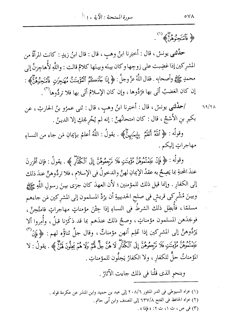 حَدَّثَنِي يُونُسُ، قَالَ: أَخْبَرَنَا ابْنُ وَهْبٍ، قَالَ: قَالَ ابْنُ زَيْدٍ كَانَتِ §الْمَرْأَةُ مِنَ الْمُشْرِكِينَ إِذَا غَضِبَتْ عَلَى زَوْجِهَا، وَكَانَ بَيْنَهُ وَبَيْنَهَا كَلَامٌ، قَالَتْ: وَاللَّهِ لَأُهَاجِرَنَّ إِلَى مُحَمَّدٍ صَلَّى اللهُ عَلَيْهِ وَسَلَّمَ وَأَصْحَابِهِ، فَقَالَ اللَّهُ عَزَّ وَجَلَّ: {إِذَا جَاءَكُمُ الْمُؤْمِنَاتُ مُهَاجِرَاتٍ فَامْتَحِنُوهُنَّ} [الممتحنة: 10] إِنْ كَانَ الْغَضَبُ أَتَى بِهَا فَرَدُّوهَا، وَإِنْ كَانَ الْإِسْلَامُ أَتَى بِهَا فَلَا تَرُدُّوهَا