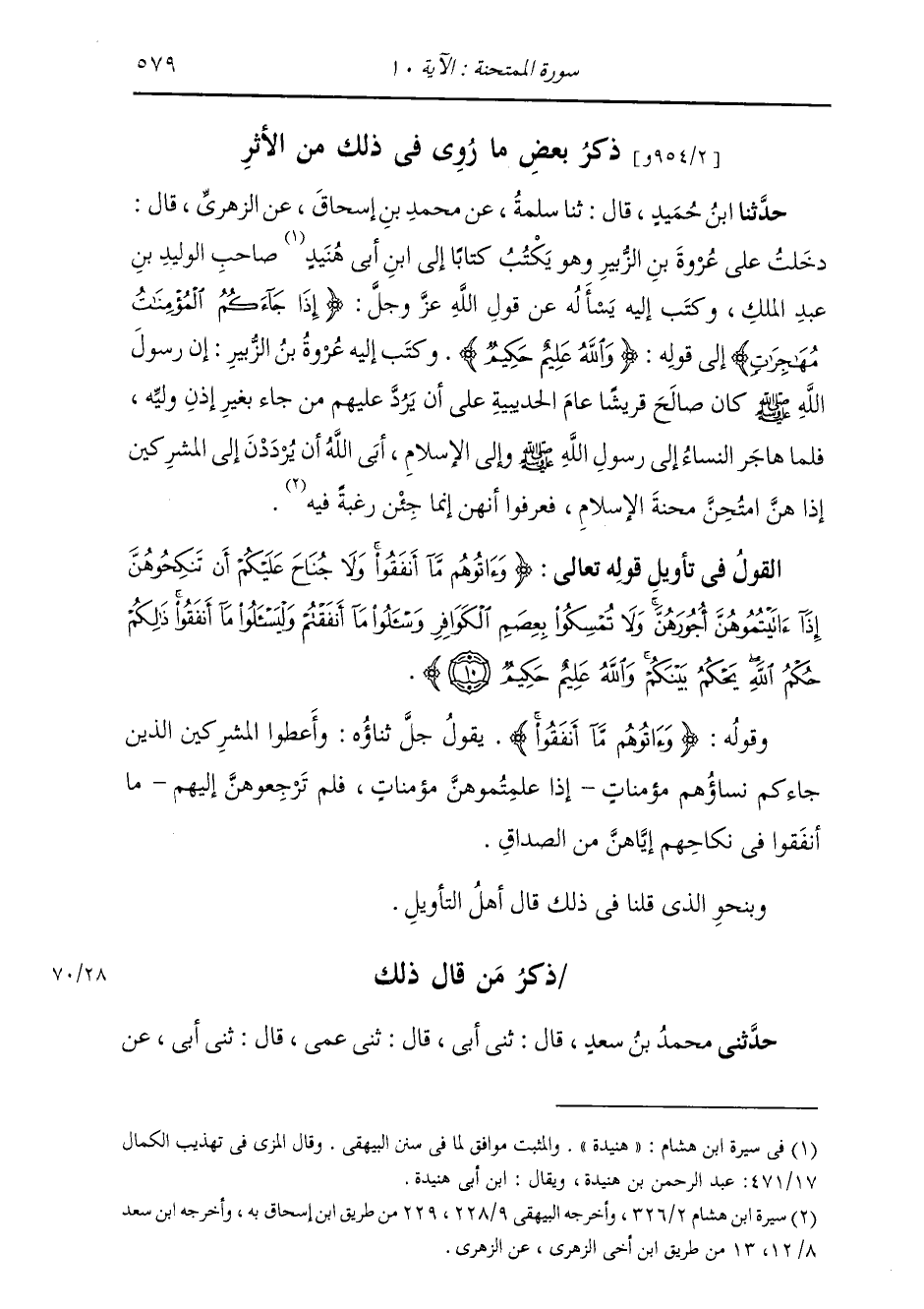 حَدَّثَنَا ابْنُ حُمَيْدٍ، قَالَ: ثنا سَلَمَةُ، عَنْ مُحَمَّدِ بْنِ إِسْحَاقَ، عَنِ الزُّهْرِيِّ، قَالَ: دَخَلْتُ عَلَى عُرْوَةَ بْنِ الزُّبَيْرِ، وَهُوَ يَكْتُبُ كِتَابًا إِلَى ابْنِ أَبِي هُنَيْدٍ صَاحِبِ الْوَلِيدِ بْنِ عَبْدِ الْمَلِكِ، وَكَتَبَ إِلَيْهِ يَسْأَلُهُ عَنْ قَوْلِ اللَّهِ عَزَّ وَجَلَّ: {إِذَا جَاءَكُمُ الْمُؤْمِنَاتُ مُهَاجِرَاتٍ} [الممتحنة: 10] إِلَى قَوْلِهِ: {وَاللَّهُ عَلِيمٌ حَكِيمٌ} [الممتحنة: 10] وَكَتَبَ إِلَيْهِ عُرْوَةُ بْنُ الزُّبَيْرِ: إِنَّ رَسُولَ اللَّهِ صَلَّى اللهُ عَلَيْهِ وَسَلَّمَ كَانَ صَالَحَ قُرَيْشًا عَامَ الْحُدَيْبِيَةَ عَلَى أَنْ يَرُدَّ عَلَيْهِمْ مَنْ جَاءَ بِغَيْرِ إِذْنِ وَلِيِّهِ؛ فَلَمَّا هَاجَرَ النِّسَاءُ إِلَى رَسُولِ اللَّهِ صَلَّى اللهُ عَلَيْهِ وَسَلَّمَ وَإِلَى الْإِسْلَامِ، §أَبَى اللَّهُ أَنْ يُرْدَدْنَ إِلَى الْمُشْرِكِينَ، إِذَا هُنَّ امْتَحَنَ مِحْنَةَ الْإِسْلَامِ، فَعَرَفُوا أَنَّهُنَّ إِنَّمَا جِئْنَ رَغْبَةً فِيهِ