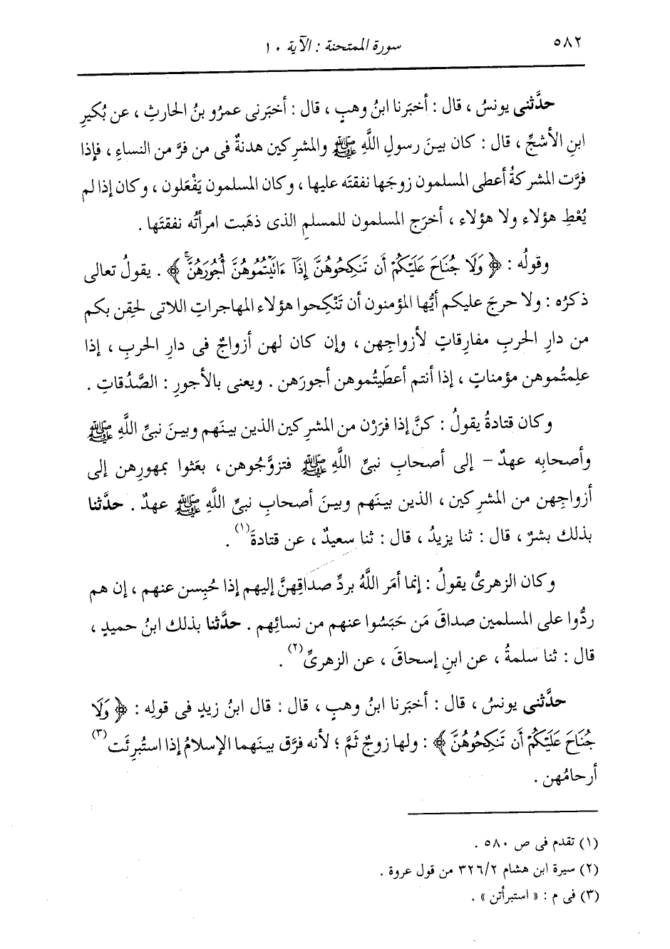 وَكَانَ قَتَادَةُ يَقُولُ: §كُنَّ إِذَا فَرَرْنَ مِنَ الْمُشْرِكِينَ الَّذِينَ بَيْنَهُمْ وَبَيْنَ نَبِيِّ اللَّهِ صَلَّى اللهُ عَلَيْهِ وَسَلَّمَ وَأَصْحَابِهِ عَهْدٌ إِلَى أَصْحَابِ نَبِيِّ اللَّهِ صَلَّى اللهُ عَلَيْهِ وَسَلَّمَ فَتَزَوَّجُوهُنَّ، بَعَثُوا بِمُهُورِهِنَّ إِلَى أَزْوَاجِهِنَّ مِنَ الْمُشْرِكِينَ الَّذِينَ بَيْنَهُمْ وَبَيْنَ أَصْحَابِ نَبِيِّ اللَّهِ صَلَّى اللهُ عَلَيْهِ وَسَلَّمَ عَهْدٌ. حَدَّثَنَا بِذَلِكَ بِشْرٌ، قَالَ: ثنا يَزِيدُ، قَالَ: ثنا سَعِيدٌ، عَنْ قَتَادَةَ