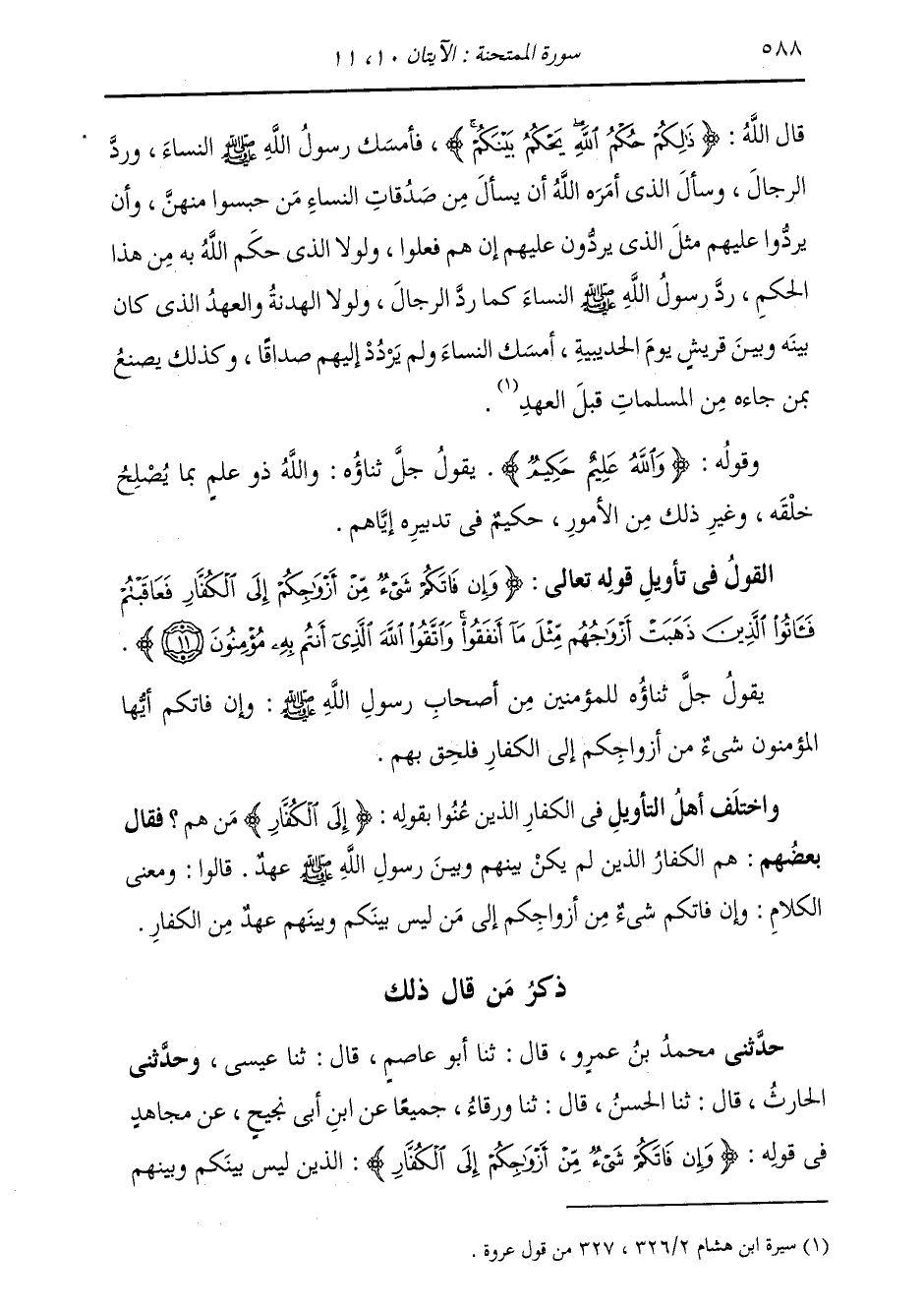 ذِكْرُ مَنْ قَالَ ذَلِكَ حَدَّثَنِي مُحَمَّدُ بْنُ عَمْرٍو، قَالَ: ثنا أَبُو عَاصِمٍ، قَالَ: ثنا عِيسَى، وَحَدَّثَنِي الْحَارِثُ، قَالَ: ثنا الْحَسَنُ، قَالَ: ثنا وَرْقَاءُ، جَمِيعًا عَنِ ابْنِ أَبِي نَجِيحٍ، عَنْ مُجَاهِدٍ، فِي قَوْلِهِ: {§وَإِنْ فَاتَكُمْ شَيْءٌ مِنْ أَزْوَاجِكُمْ إِلَى الْكُفَّارِ} [الممتحنة: 11] الَّذِينَ لَيْسَ بَيْنَكُمْ وَبَيْنَهُمْ -[589]- عَهْدٌ