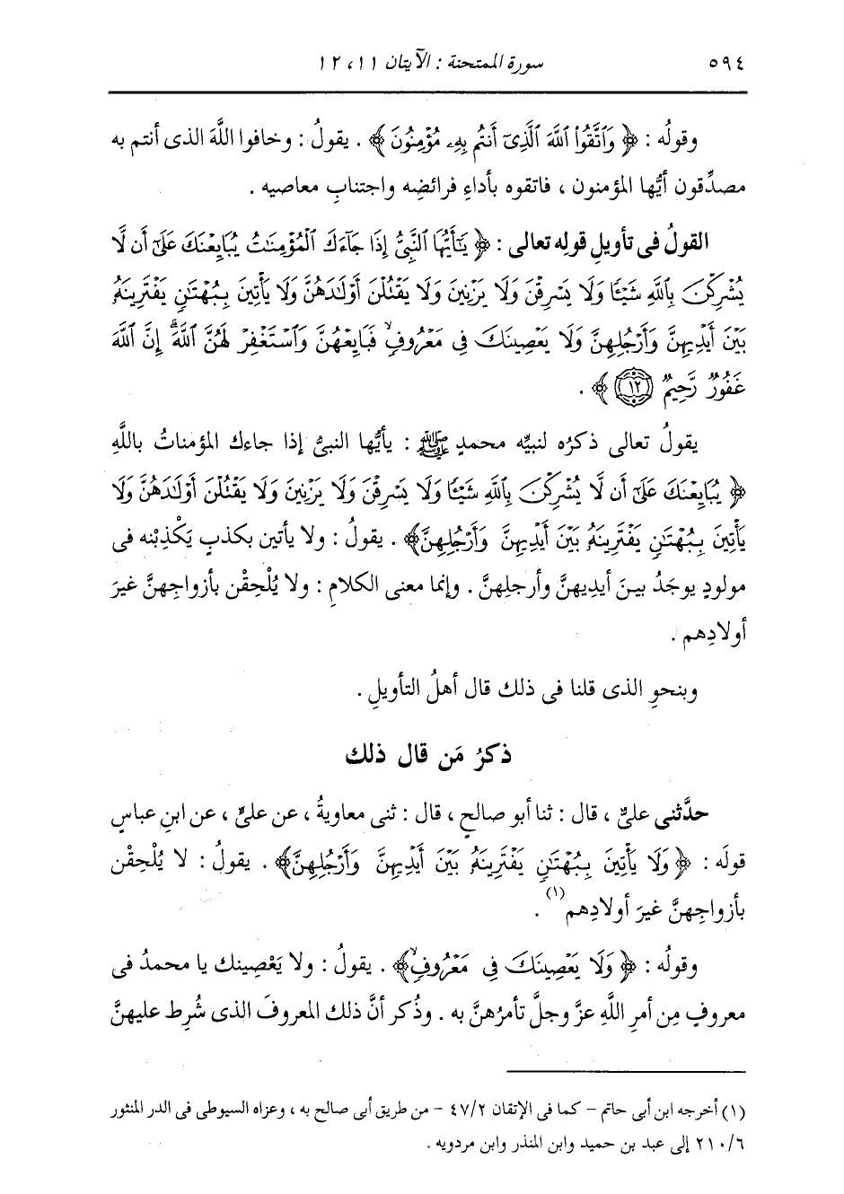 §الْقَوْلُ فِي تَأْوِيلِ قَوْلِهِ تَعَالَى: {يَا أَيُّهَا النَّبِيُّ إِذَا جَاءَكَ الْمُؤْمِنَاتُ يُبَايِعْنَكَ عَلَى أَنْ لَا يُشْرِكْنَ بِاللَّهِ شَيْئًا وَلَا يَسْرِقْنَ وَلَا يَزْنِينَ وَلَا يَقْتُلْنَ أَوْلَادَهُنَّ وَلَا يَأْتِينَ بِبُهْتَانٍ يَفْتَرِينَهُ بَيْنَ أَيْدِيهِنَّ وَأَرْجُلِهِنَّ وَلَا يَعْصِينَكَ فِي مَعْرُوفٍ فَبَايِعْهُنَّ وَاسْتَغْفِرْ لَهُنَّ اللَّهَ إِنَّ اللَّهَ غَفُورٌ رَحِيمٌ} [الممتحنة: 12] يَقُولُ تَعَالَى ذِكْرُهُ لِنَبِيِّهِ مُحَمَّدٍ صَلَّى اللهُ عَلَيْهِ وَسَلَّمَ: يَا أَيُّهَا النَّبِيُّ إِذَا جَاءَكَ الْمُؤْمِنَاتُ بِاللَّهِ يُبَايِعْنَكَ عَلَى أَنْ لَا يُشْرِكْنَ بِاللَّهِ شَيْئًا وَلَا يَسْرِقْنَ وَلَا يَزْنِينَ وَلَا يَقْتُلْنَ أَوْلَادَهُنَّ وَلَا يَأْتِينَ بِبُهْتَانٍ يَفْتَرِينَهُ بَيْنَ أَيْدِيهِنَّ وَأَرْجُلِهِنَّ يَقُولُ: وَلَا يَأْتِينَ بِكَذِبٍ يَكْذِبْنَهُ فِي مَوْلُودٍ يُوجَدُ بَيْنَ أَيْدِيهِنَّ وَأَرْجُلِهِنَّ. وَإِنَّمَا مَعْنَى الْكَلَامِ: وَلَا يُلْحِقْنَ بِأَزْوَاجِهِنَّ غَيْرَ أَوْلَادِهِمْ. وَبِنَحْوِ الَّذِي قُلْنَا فِي ذَلِكَ قَالَ أَهْلُ التَّأْوِيلِ.