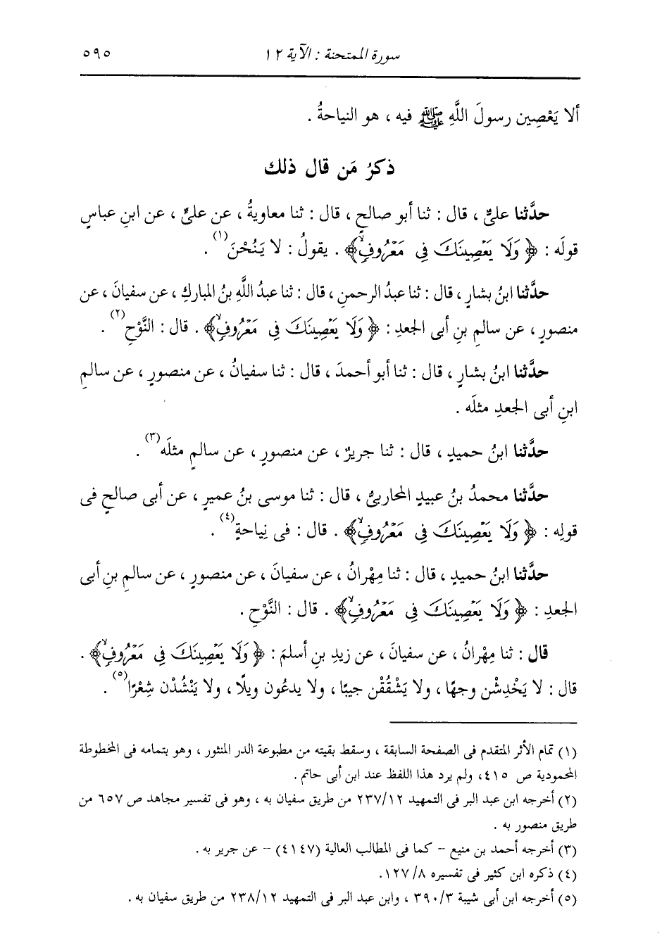 حَدَّثَنَا ابْنُ بَشَّارٍ، قَالَ: ثنا عَبْدُ الرَّحْمَنِ، قَالَ: ثنا عَبْدُ اللَّهِ بْنُ الْمُبَارَكِ، عَنْ سُفْيَانَ، عَنْ مَنْصُورٍ، عَنْ سَالِمِ بْنِ أَبِي الْجَعْدِ، {§وَلَا يَعْصِينَكَ فِي مَعْرُوفٍ} [الممتحنة: 12] قَالَ: النَّوْحُ. حَدَّثَنَا ابْنُ بَشَّارٍ، قَالَ: ثنا أَبُو أَحْمَدَ، قَالَ: ثنا سُفْيَانُ، عَنْ مَنْصُورٍ، عَنْ سَالِمِ بْنِ أَبِي الْجَعْدِ، مِثْلَهُ. حَدَّثَنَا ابْنُ حُمَيْدٍ، قَالَ: ثنا جَرِيرٌ، عَنْ مَنْصُورٍ، عَنْ سَالِمٍ، مِثْلَهُ