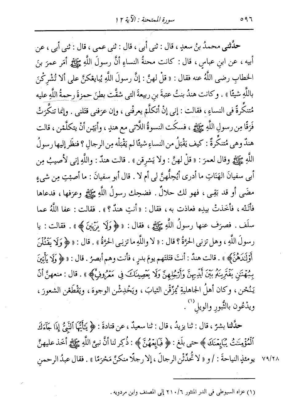 حَدَّثَنَا بِشْرٌ، قَالَ: ثنا يَزِيدُ، قَالَ: ثنا سَعِيدٌ، عَنْ قَتَادَةَ، {يَا أَيُّهَا النَّبِيُّ إِذَا جَاءَكَ الْمُؤْمِنَاتُ يُبَايِعْنَكَ} [الممتحنة: 12] حَتَّى بَلَغَ {فَبَايِعْهُنَّ} [الممتحنة: 12] ذُكِرَ لَنَا أَنَّ نَبِيَّ اللَّهِ صَلَّى اللهُ عَلَيْهِ وَسَلَّمَ أَخَذَ عَلَيْهِنَّ يَوْمَئِذٍ النِّيَاحَةَ: «§وَلَا تُحَدِّثْنَ الرِّجَالَ، إِلَّا رَجُلًا مِنْكُنَّ مَحْرَمًا» . فَقَالَ عَبْدُ الرَّحْمَنِ -[597]- بْنُ عَوْفٍ: يَا نَبِيَّ اللَّهِ إِنَّ لَنَا أَضْيَافًا، وَإِنَّا نَغِيبُ عَنْ نِسَائِنَا. قَالَ: فَقَالَ رَسُولُ اللَّهِ: «لَيْسَ أُولَئِكَ عَنَيْتُ»