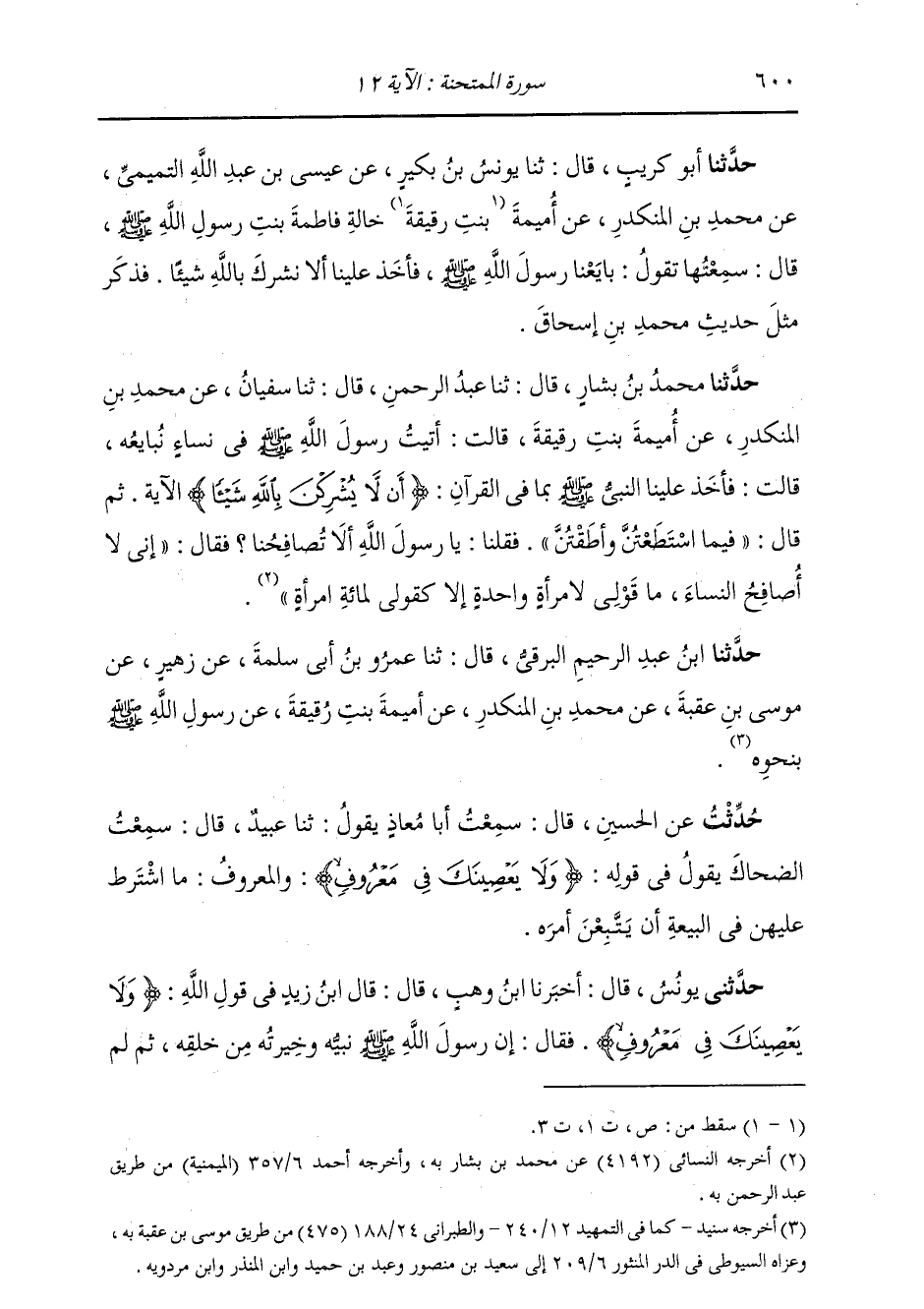 حَدَّثَنَا مُحَمَّدُ بْنُ بَشَّارٍ، قَالَ: ثنا عَبْدُ الرَّحْمَنِ، قَالَ: ثنا سُفْيَانُ، عَنْ مُحَمَّدِ بْنِ الْمُنْكَدِرِ، عَنْ أُمَيْمَةَ بِنْتِ رُقَيْقَةَ، قَالَتْ: أَتَيْتُ رَسُولَ اللَّهِ صَلَّى اللهُ عَلَيْهِ وَسَلَّمَ فِي نِسَاءٍ نُبَايِعْهُ، قَالَتْ: فَأَخَذَ عَلَيْنَا النَّبِيُّ صَلَّى اللهُ عَلَيْهِ وَسَلَّمَ بِمَا فِي الْقُرْآنِ {أَنْ لَا يُشْرِكْنَ بِاللَّهِ شَيْئًا} [الممتحنة: 12] الْآيَةُ، ثُمَّ قَالَ: «§فِيمَا اسْتَطَعْتُنَّ وَأَطَقْتُنَّ» . فَقُلْنَا: يَا رَسُولَ اللَّهِ أَلَا تُصَافِحُنَا؟ فَقَالَ: «إِنِّي لَا أُصَافِحُ النِّسَاءَ، مَا قَوْلِي لِامْرَأَةٍ وَاحِدَةٍ إِلَّا كَقَوْلِي لِمِائَةِ امْرَأَةٍ» . حَدَّثَنَا ابْنُ عَبْدِ الرَّحِيمِ الْبَرْقِيُّ، قَالَ: ثنا عَمْرُو بْنُ أَبِي سَلَمَةَ، عَنْ زُهَيْرٍ، عَنْ مُوسَى بْنِ عُقْبَةَ، عَنْ مُحَمَّدِ بْنِ الْمُنْكَدِرِ، عَنْ أُمَيْمَةَ بِنْتِ رُقَيْقَةَ، عَنْ رَسُولِ اللَّهِ صَلَّى اللهُ عَلَيْهِ وَسَلَّمَ بِنَحْوِهِ