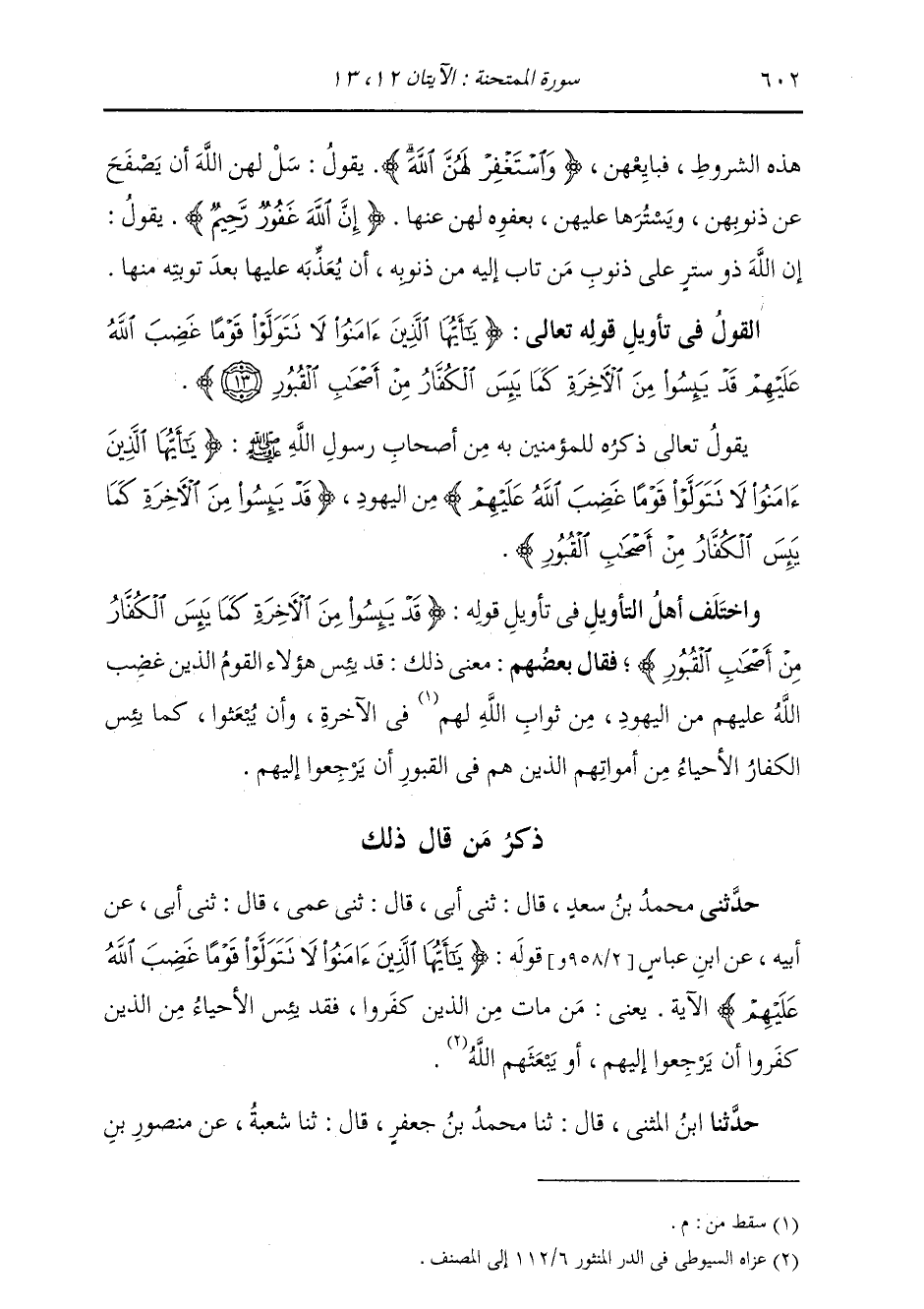 ذِكْرُ مَنْ قَالَ ذَلِكَ حَدَّثَنِي مُحَمَّدُ بْنُ سَعْدٍ، قَالَ: ثني أَبِي، قَالَ: ثني عَمِّي، قَالَ: ثني أَبِي، عَنْ أَبِيهِ، عَنِ ابْنِ عَبَّاسٍ، قَوْلُهُ: {§يَا أَيُّهَا الَّذِينَ آمَنُوا لَا تَتَوَلَّوْا قَوْمًا غَضِبَ اللَّهُ عَلَيْهِمْ} [الممتحنة: 13] الْآيَةُ، يَعْنِي مَنْ مَاتَ مِنَ الَّذِينَ كَفَرُوا، فَقَدْ يَئِسَ الْأَحْيَاءُ مِنَ الَّذِينَ كَفَرُوا أَنْ يَرْجِعُوا إِلَيْهِمْ، أَوْ يَبْعَثَهُمُ اللَّهُ