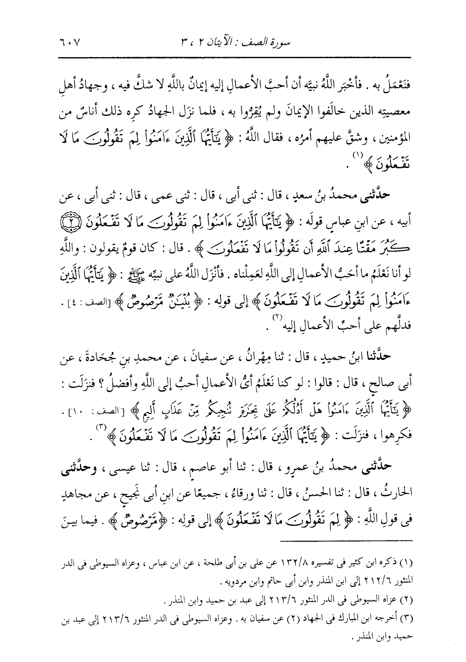 حَدَّثَنِي مُحَمَّدُ بْنُ سَعْدٍ، قَالَ: ثني أَبِي، قَالَ: ثني عَمِّي، قَالَ: ثني أَبِي، عَنْ أَبِيهِ، عَنِ ابْنِ عَبَّاسٍ، قَوْلُهُ: {يَا أَيُّهَا الَّذِينَ آمَنُوا لِمَ تَقُولُونَ مَا لَا تَفْعَلُونَ كَبُرَ مَقْتًا عِنْدَ اللَّهِ أَنْ تَقُولُوا مَا لَا تَفْعَلُونَ} [الصف: 3] قَالَ: كَانَ قَوْمٌ يَقُولُونَ: وَاللَّهِ §لَوْ أَنَّا نَعْلَمُ مَا أَحَبُّ الْأَعْمَالِ إِلَى اللَّهِ لَعَمِلْنَاهُ، فَأَنْزَلَ اللَّهُ عَلَى نَبِيِّهِ صَلَّى اللهُ عَلَيْهِ وَسَلَّمَ: {يَا أَيُّهَا الَّذِينَ آمَنُوا لِمَ تَقُولُونَ مَا لَا تَفْعَلُونَ كَبُرَ مَقْتًا} [الصف: 2] إِلَى قَوْلِهِ: {بُنْيَانٌ مَرْصُوصٌ} [الصف: 4] فَدَلَّهُمْ عَلَى أَحَبِّ الْأَعْمَالِ إِلَيْهِ