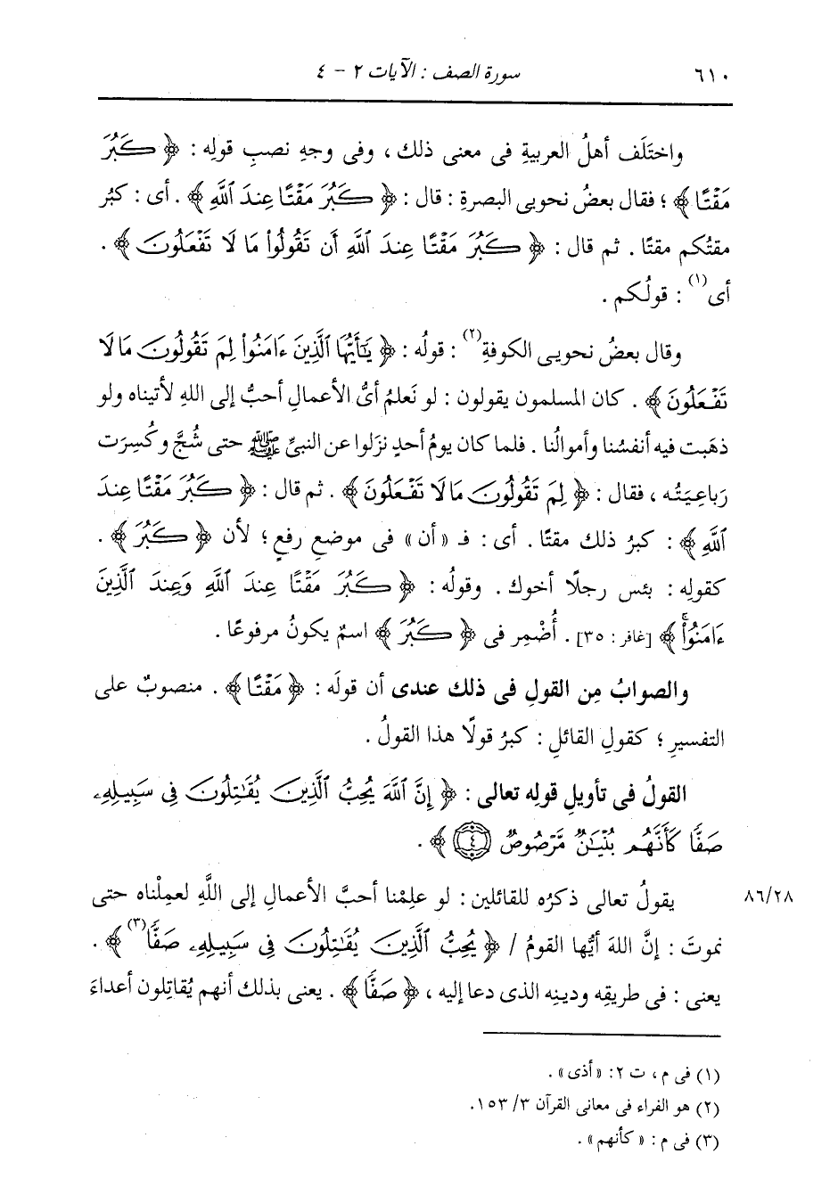 وَاخْتَلَفَتْ أَهْلُ الْعَرَبِيَّةِ فِي مَعْنَى ذَلِكَ، وَفِي وَجْهِ نَصْبِ قَوْلِهِ: {كَبُرَ مَقْتًا} [غافر: 35] فَقَالَ بَعْضُ نَحْوِيِّ الْبَصْرَةِ: قَالَ: {كَبُرَ مَقْتًا عِنْدَ اللَّهِ} [غافر: 35] أَيْ: كَبُرَ مَقْتُكُمْ مَقْتًا. ثُمَّ قَالَ: {أَنْ تَقُولُوا مَا لَا تَفْعَلُونَ} [الصف: 3] أَذَى قَوْلِكُمْ. وَقَالَ بَعْضُ نَحْوِيِّ الْكُوفَةِ: قَوْلُهُ: {يَا أَيُّهَا الَّذِينَ آمَنُوا لِمَ تَقُولُونَ مَا لَا تَفْعَلُونَ} [الصف: 2] كَانَ الْمُسْلِمُونَ يَقُولُونَ: لَوْ نَعْلَمُ أَيَّ الْأَعْمَالِ أَحَبَّ إِلَى اللَّهِ لَأَتَيْنَاهُ، وَلَوْ ذَهَبَتْ فِيهِ أَنْفُسُنَا وَأَمْوَالُنَا؛ فَلَمَّا كَانَ يَوْمَ أُحُدٍ، نَزَلُوا عَنِ النَّبِيِّ صَلَّى اللهُ عَلَيْهِ وَسَلَّمَ حَتَّى شُجَّ، وَكُسِرَتْ رَبَاعِيَتُهُ، فَقَالَ: {لِمَ تَقُولُونَ مَا لَا تَفْعَلُونَ} [الصف: 2] ثُمَّ قَالَ: {كَبُرَ مَقْتًا عِنْدَ اللَّهِ} [غافر: 35] كَبُرَ ذَلِكَ مَقْتًا. أَيْ: فَأَنْ فِي مَوْضِعِ رَفْعٍ، لِأَنَّ كَبُرَ كَقَوْلِهِ: بِئْسَ رَجُلًا أَخُوكَ