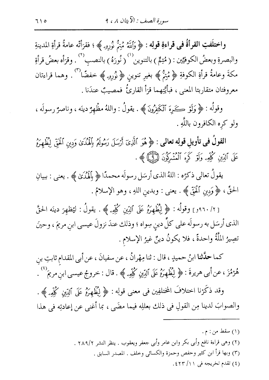 كَمَا: حَدَّثَنَا ابْنُ حُمَيْدٍ، قَالَ: ثنا مِهْرَانُ، عَنْ سُفْيَانَ، عَنْ أَبِي الْمِقْدَامِ ثَابِتِ بْنِ هُرْمُزٍ، عَنْ أَبِي هُرَيْرَةَ، {§لِيُظْهِرَهُ عَلَى الدِّينِ كُلِّهِ} [الصف: 9] قَالَ: خُرُوجُ عِيسَى ابْنِ مَرْيَمَ وَقَدْ ذَكَرْنَا اخْتِلَافَ الْمُخْتَلِفِينَ فِي مَعْنَى قَوْلِهِ: {لِيُظْهِرَهُ عَلَى الدِّينِ كُلِّهِ} [الصف: 9] وَالصَّوَابُ عِنْدَنَا مِنَ الْقَوْلِ فِي ذَلِكَ بِعِلَلِهِ فِيمَا مَضَى بِمَا أَغْنَى عَنْ إِعَادَتِهِ فِي هَذَا -[616]- الْمَوْضِعِ