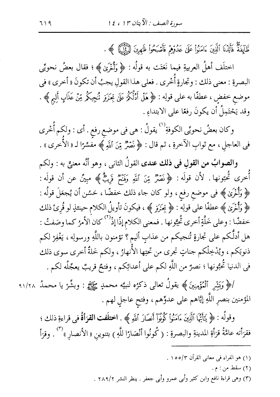 طَائِفَةٌ فَأَيَّدْنَا الَّذِينَ آمَنُوا عَلَى عَدُوِّهِمْ فَأَصْبَحُوا ظَاهِرِينَ} [الصف: 14] اخْتَلَفَ أَهْلُ الْعَرَبِيَّةِ فِيمَا نَعَتَتْ بِهِ قَوْلُهُ: {وَأُخْرَى} [آل عمران: 13] فَقَالَ بَعْضُ نَحْوِيِّ الْبَصْرَةِ: مَعْنَى ذَلِكَ: وَتِجَارَةٍ أُخْرَى، فَعَلَى هَذَا الْقَوْلِ يَجِبُ أَنْ يَكُونَ أُخْرَى فِي مَوْضِعِ خَفْضٍ عَطْفًا بِهِ عَلَى قَوْلِهِ: {هَلْ أَدُلُّكُمْ عَلَى تِجَارَةٍ تُنْجِيكُمْ مِنْ عَذَابٍ أَلِيمٍ} [الصف: 10] وَقَدْ يَحْتَمِلُ أَنْ يَكُونَ رَفْعًا عَلَى الِابْتِدَاءِ. وَكَانَ بَعْضُ نَحْوِيِّ الْكُوفَةِ يَقُولُ: هِيَ فِي مَوْضِعِ رَفْعٍ. أَيْ: وَلَكُمْ أُخْرَى فِي الْعَاجِلِ مَعَ ثَوَابِ الْآخِرَةِ، ثُمَّ قَالَ: {نَصْرٌ مِنَ اللَّهِ} [الصف: 13] مُفَسِّرًا لِلْأُخْرَى. وَالصَّوَابُ مِنَ الْقَوْلِ فِي ذَلِكَ عِنْدِي الْقَوْلُ الثَّانِي، وَهُوَ أَنَّهُ مَعْنِيٌّ بِهِ: وَلَكُمْ أُخْرَى تُحِبُّونَهَا، لِأَنَّ قَوْلَهُ {نَصْرٌ مِنَ اللَّهِ وَفَتْحٌ قَرِيبٌ} [الصف: 13] مُبَيِّنٌ عَنْ أَنَّ قَوْلَهُ {وَأُخْرَى} [آل عمران: 13] فِي مَوْضِعِ رَفْعٍ، وَلَوْ كَانَ جَاءَ ذَلِكَ خَفْضًا حَسُنَ أَنْ يَجْعَلَ قَوْلَهُ وَأُخْرَى عَطْفًا عَلَى قَوْلِهِ: {تِجَارَةٍ} [البقرة: 282] فَيَكُونُ تَأْوِيلُ الْكَلَامِ حِينَئِذٍ لَوْ قُرِئَ ذَلِكَ خَفْضًا، وَعَلَى خَلَّةٍ أُخْرَى تُحِبُّونَهَا، فَمَعْنَى الْكَلَامِ إِذَا كَانَ الْأَمْرُ كَمَا وَصَفْتُ: هَلْ أَدُلُّكُمْ عَلَى تِجَارَةٍ تُنْجِيكُمْ مِنْ عَذَابٍ أَلِيمٍ تُؤْمِنُونَ بِاللَّهِ وَرَسُولِهِ يَغْفِرْ لَكُمْ ذُنُوبَكُمْ، وَيُدْخِلْكُمْ جَنَّاتٍ تَجْرِي مِنْ تَحْتِهَا الْأَنْهَارُ، وَلَكُمْ خَلَّةٌ أُخْرَى سِوَى ذَلِكَ فِي الدُّنْيَا تُحِبُّونَهَا: {نَصْرٌ مِنَ اللَّهِ} [الصف: 13] لَكُمْ عَلَى أَعْدَائِكُمْ، {وَفَتْحٌ قَرِيبٌ} [الصف: 13] يُعَجِّلُهُ لَكُمْ.