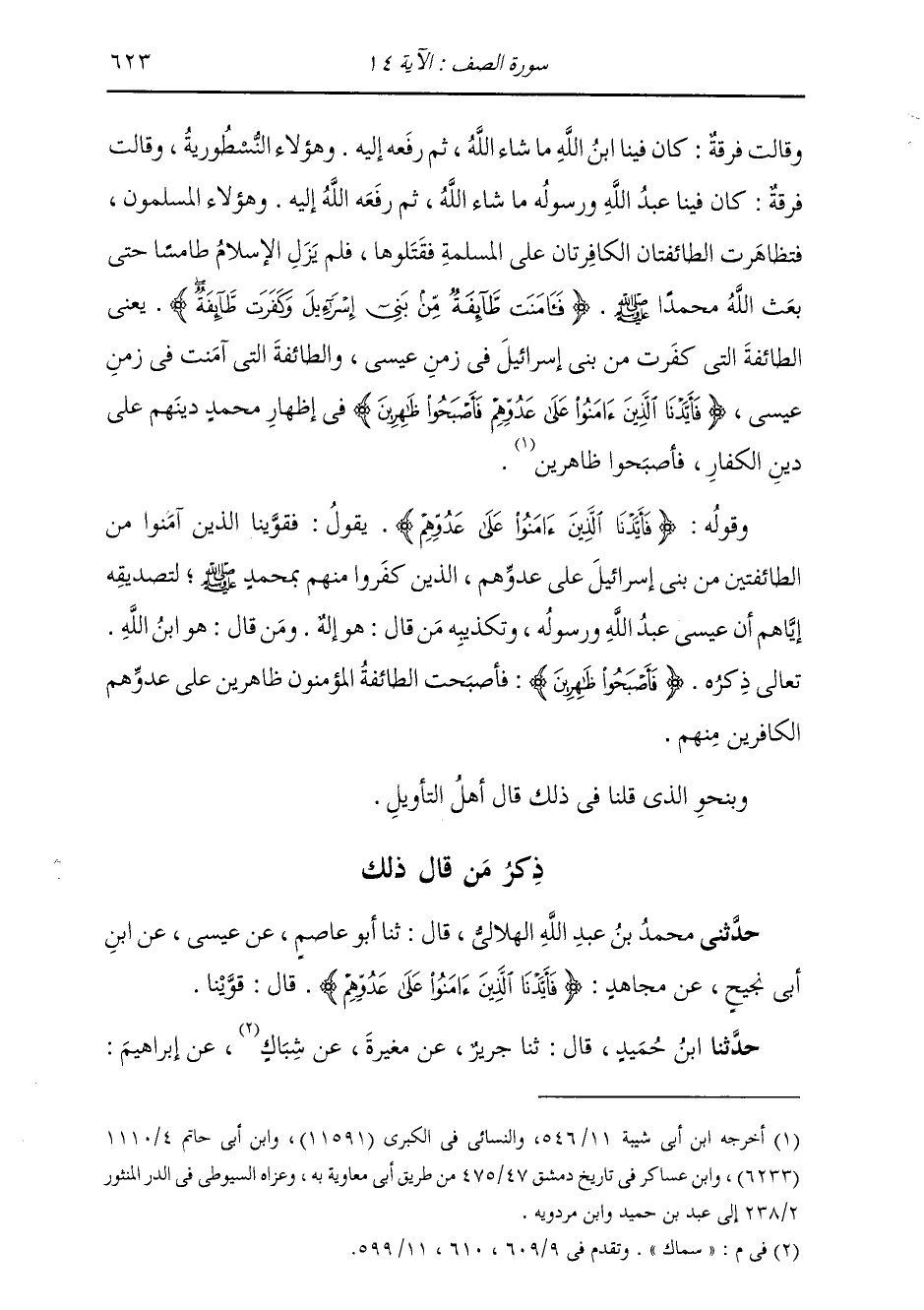 حَدَّثَنَا ابْنُ حُمَيْدٍ، قَالَ: ثنا جَرِيرٌ، عَنْ مُغِيرَةَ، عَنْ سِمَاكٍ، عَنْ إِبْرَاهِيمَ -[624]-، {§فَآمَنَتْ طَائِفَةٌ مِنْ بَنِي إِسْرَائِيلَ وَكَفَرَتْ طَائِفَةٌ} [الصف: 14] قَالَ: لَمَّا بَعَثَ اللَّهُ مُحَمَّدًا، وَنَزَلَ تَصْدِيقُ مَنْ آمَنَ بِعِيسَى، أَصْبَحَتْ حُجَّةُ مَنْ آمَنَ بِهِ ظَاهِرَةٌ