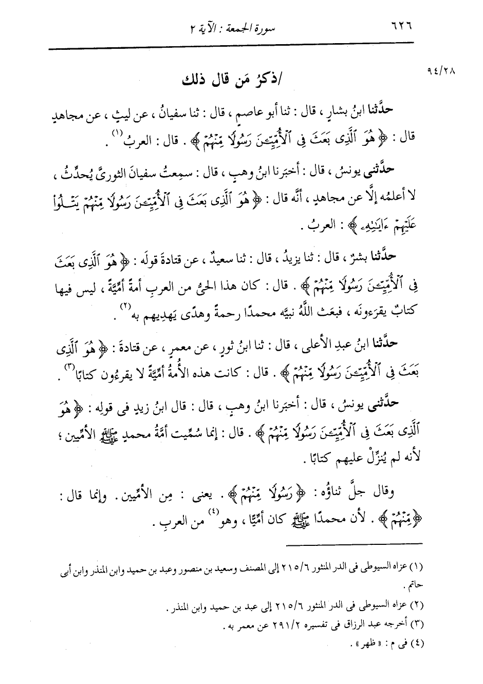 ذِكْرُ مَنْ قَالَ ذَلِكَ حَدَّثَنَا ابْنُ بَشَّارٍ، قَالَ: ثنا أَبُو عَاصِمٍ، قَالَ: ثنا سُفْيَانُ، عَنْ لَيْثٍ، عَنْ مُجَاهِدٍ، قَالَ: {§هُوَ الَّذِي بَعَثَ فِي الْأُمِّيِّينَ رَسُولًا مِنْهُمْ} [الجمعة: 2] قَالَ: الْعَرَبُ