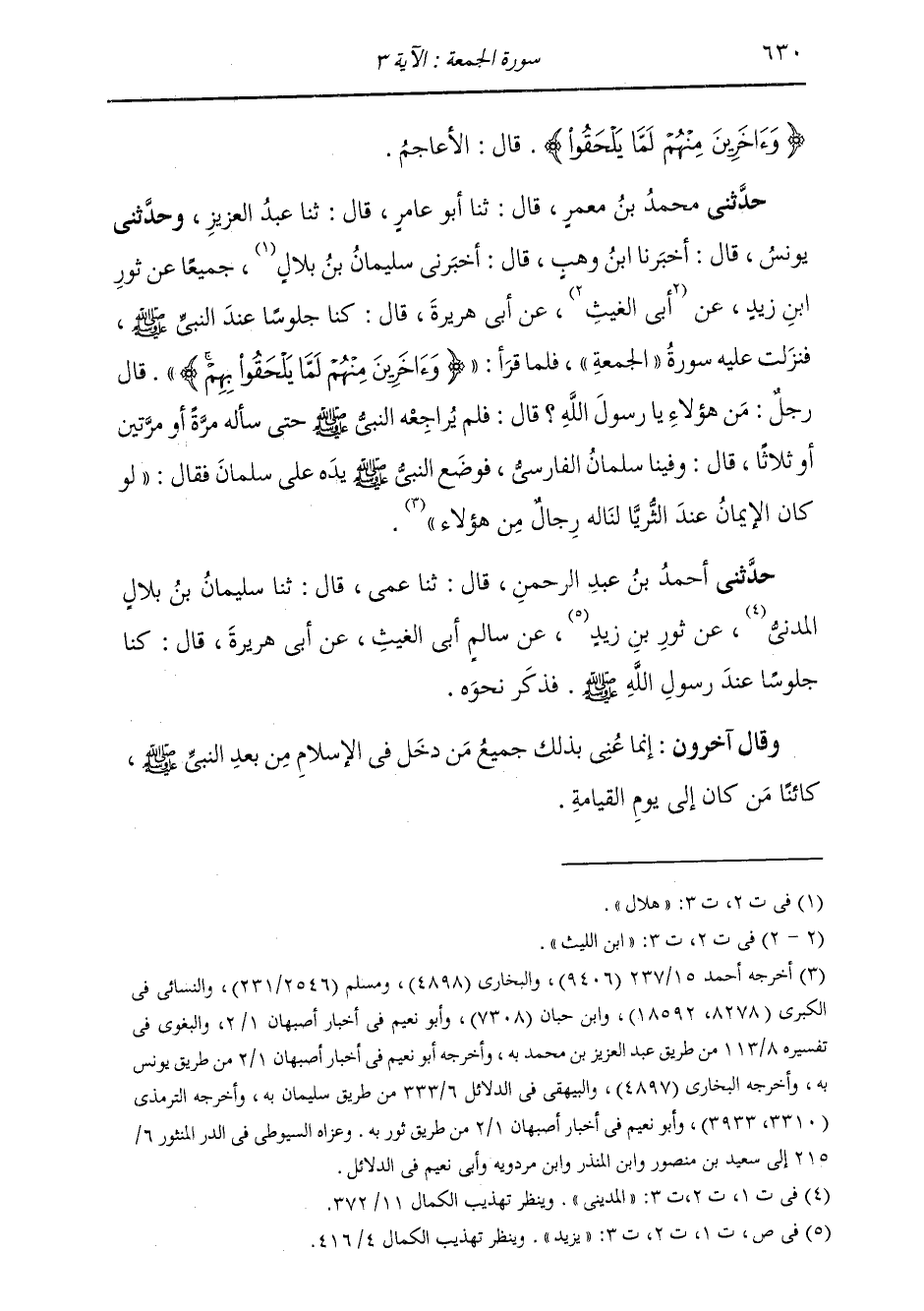 حَدَّثَنِي مُحَمَّدُ بْنُ مَعْمَرٍ، قَالَ: ثنا أَبُو عَامِرٍ، قَالَ: ثنا عَبْدُ الْعَزِيزِ، وَحَدَّثَنِي يُونُسُ، قَالَ: أَخْبَرَنَا ابْنُ وَهْبٍ، قَالَ: أَخْبَرَنِي سُلَيْمَانُ بْنُ بِلَالٍ، جَمِيعًا عَنْ ثَوْرِ بْنِ زَيْدٍ، عَنْ أَبِي الْغَيْثِ، عَنْ أَبِي هُرَيْرَةَ، قَالَ: كُنَّا جُلُوسًا عِنْدَ النَّبِيِّ صَلَّى اللهُ عَلَيْهِ وَسَلَّمَ، فَنَزَلَتْ عَلَيْهِ سُورَةُ الْجُمُعَةِ، فَلَمَّا قَرَأَ: {وَآخَرِينَ مِنْهُمْ لَمَّا يَلْحَقُوا بِهِمْ} [الجمعة: 3] قَالَ رَجُلٌ: مَنْ هَؤُلَاءِ يَا رَسُولَ اللَّهِ؟ قَالَ: فَلَمْ يُرَاجِعْهُ النَّبِيُّ صَلَّى اللهُ عَلَيْهِ وَسَلَّمَ حَتَّى سَأَلَهُ مَرَّةً أَوْ مَرَّتَيْنِ أَوْ ثَلَاثًا، قَالَ: وَفِينَا سَلْمَانُ الْفَارِسِيُّ، فَوَضَعَ النَّبِيُّ صَلَّى اللهُ عَلَيْهِ وَسَلَّمَ يَدَهُ عَلَى سَلْمَانَ فَقَالَ: «§لَوْ كَانَ الْإِيمَانُ عِنْدَ الثُّرَيَّا لَنَالَهُ رِجَالٌ مِنْ هَؤُلَاءِ» . حَدَّثَنِي أَحْمَدُ بْنُ عَبْدِ الرَّحْمَنِ، قَالَ: ثنا عَمِّي، قَالَ: ثنا سُلَيْمَانُ بْنُ بِلَالٍ الْمَدَنِيُّ، عَنْ ثَوْرِ بْنِ زَيْدٍ، عَنْ سَالِمٍ أَبِي الْغَيْثِ، عَنْ أَبِي هُرَيْرَةَ، قَالَ: كُنَّا جُلُوسًا عِنْدَ رَسُولِ اللَّهِ صَلَّى اللهُ عَلَيْهِ وَسَلَّمَ، فَذَكَرَ نَحْوَهُ وَقَالَ آخَرُونَ: إِنَّمَا عُنِيَ بِذَلِكَ جَمِيعُ مَنْ دَخَلَ فِي الْإِسْلَامِ مِنْ بَعْدِ النَّبِيِّ صَلَّى اللهُ عَلَيْهِ وَسَلَّمَ كَائِنًا مَنْ كَانَ إِلَى يَوْمِ الْقِيَامَةِ