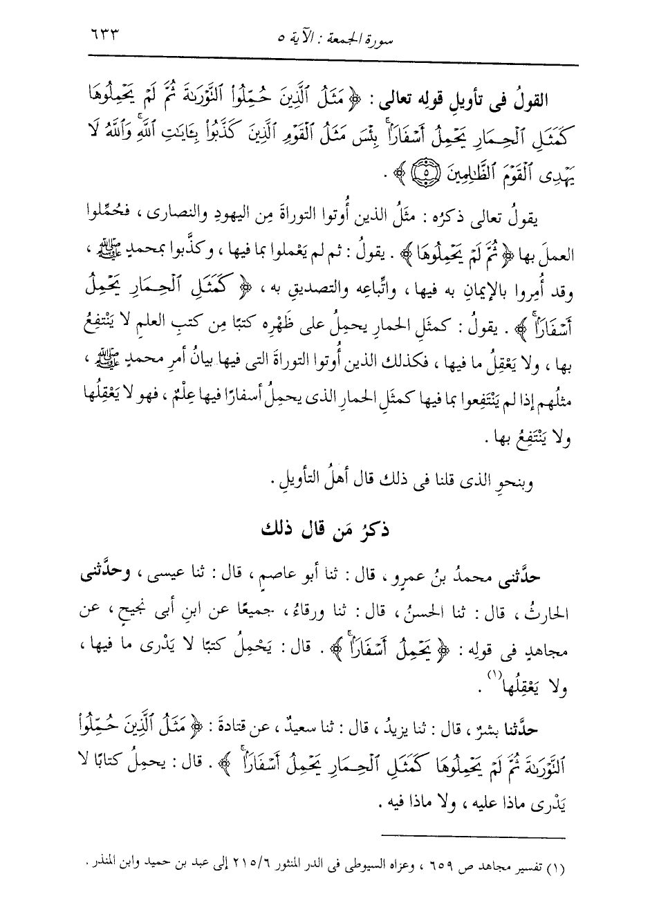 ذِكْرُ مَنْ قَالَ ذَلِكَ حَدَّثَنِي مُحَمَّدُ بْنُ عَمْرٍو، قَالَ: ثنا أَبُو عَاصِمٍ، قَالَ: ثنا عِيسَى، وَحَدَّثَنِي الْحَارِثُ، قَالَ: ثنا الْحَسَنُ، قَالَ: ثنا وَرْقَاءُ، جَمِيعًا عَنِ ابْنِ أَبِي نَجِيحٍ، فِي قَوْلِهِ: {§يَحْمِلُ أَسْفَارًا} [الجمعة: 5] قَالَ: يَحْمِلُ كُتُبًا لَا يَدْرِي مَا فِيهَا، وَلَا يَعْقِلُهَا