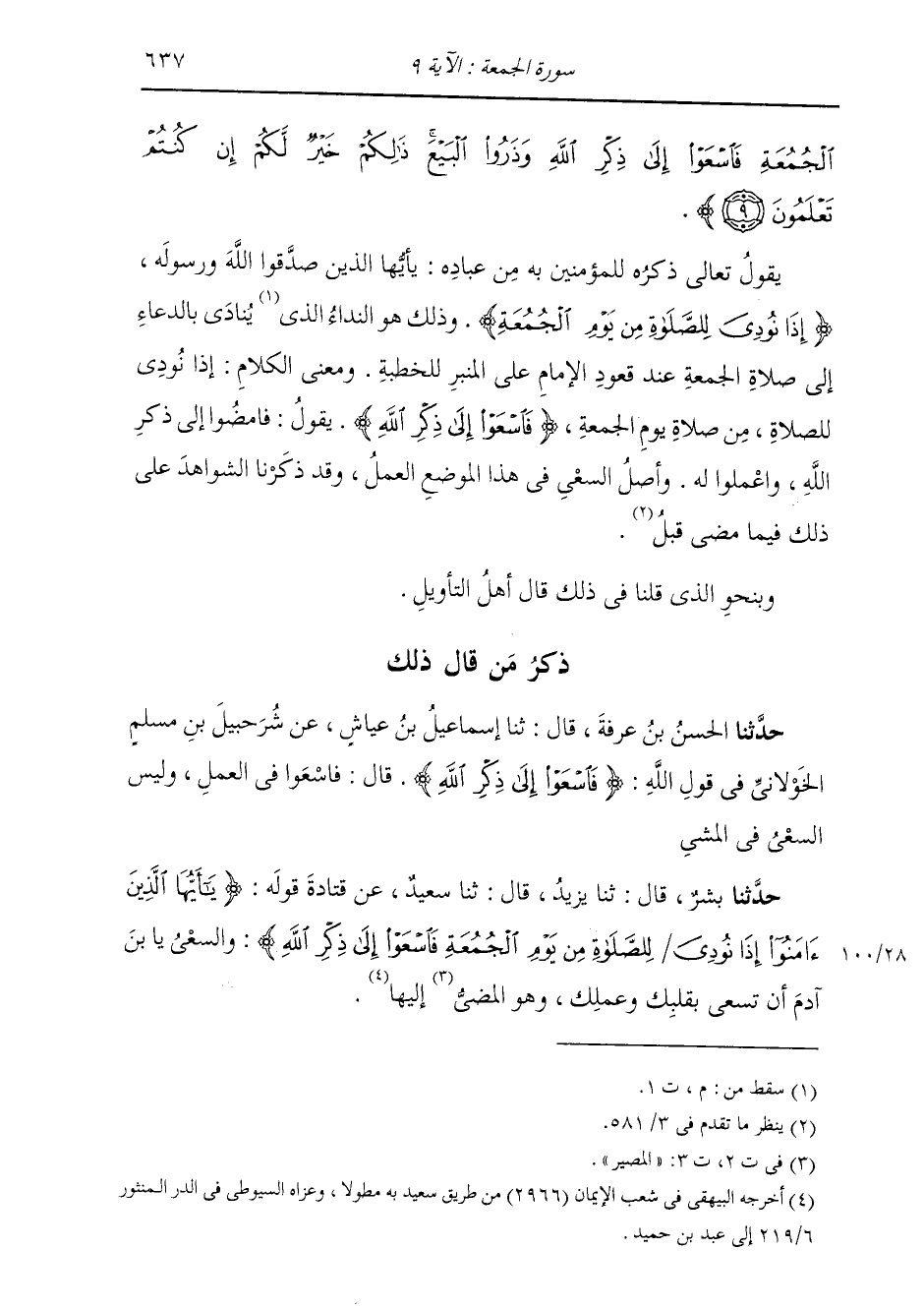 حَدَّثَنَا بِشْرٌ، قَالَ: ثنا يَزِيدُ، قَالَ: ثنا سَعِيدٌ، عَنْ قَتَادَةَ، قَوْلُهُ: {يَا أَيُّهَا الَّذِينَ آمَنُوا إِذَا نُودِيَ لِلصَّلَاةِ مِنْ يَوْمِ الْجُمُعَةِ فَاسْعَوْا إِلَى ذِكْرِ اللَّهِ} [الجمعة: 9] §وَالسَّعْيُ يَا ابْنَ آدَمَ أَنْ تَسْعَى بِقَلْبِكَ وَعَمَلِكَ، وَهُوَ الْمُضِيُّ إِلَيْهَا