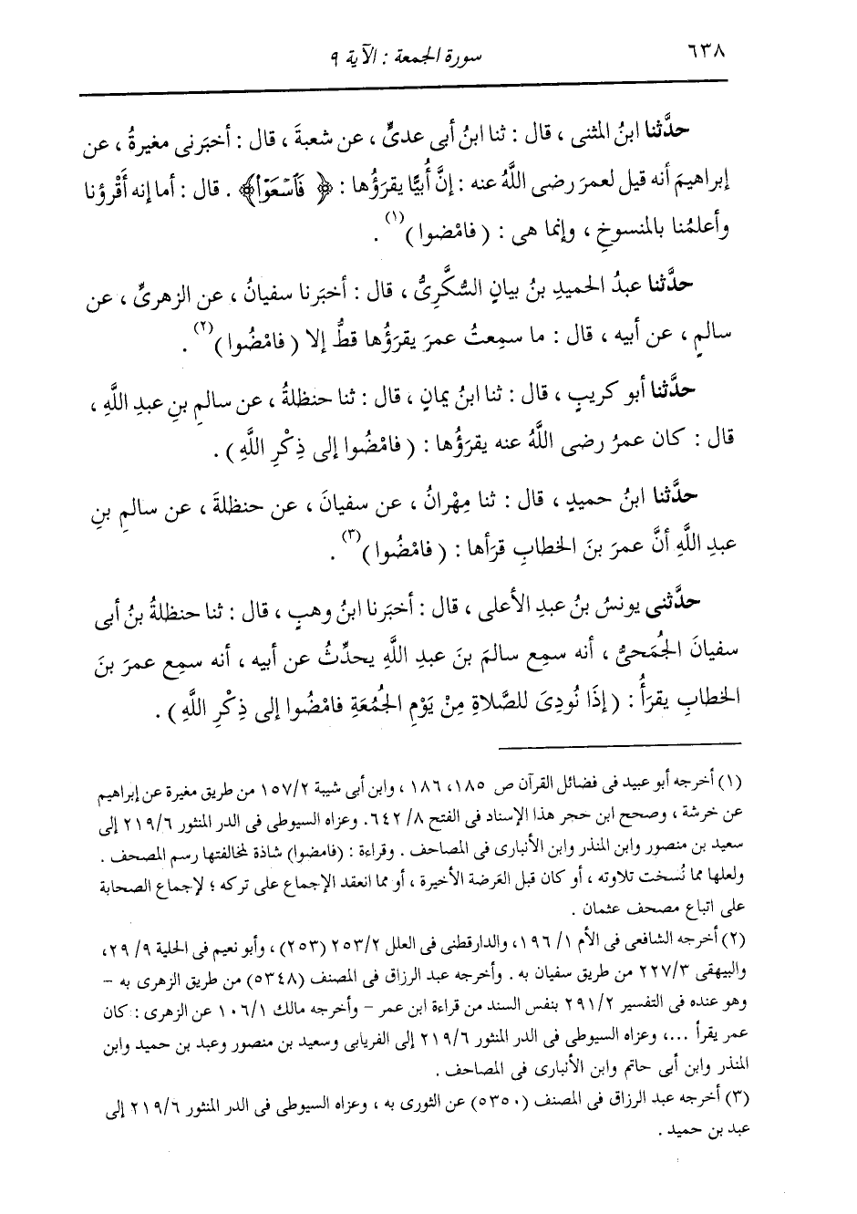 حَدَّثَنَا أَبُو كُرَيْبٍ، قَالَ: ثنا ابْنُ يَمَانٍ، قَالَ: ثنا حَنْظَلَةُ، عَنْ سَالِمِ بْنِ عَبْدِ اللَّهِ، قَالَ: كَانَ عُمَرُ رَضِيَ اللَّهُ عَنْهُ §يَقْرَؤُهَا: «فَامْضُوا إِلَى ذِكْرِ اللَّهِ»